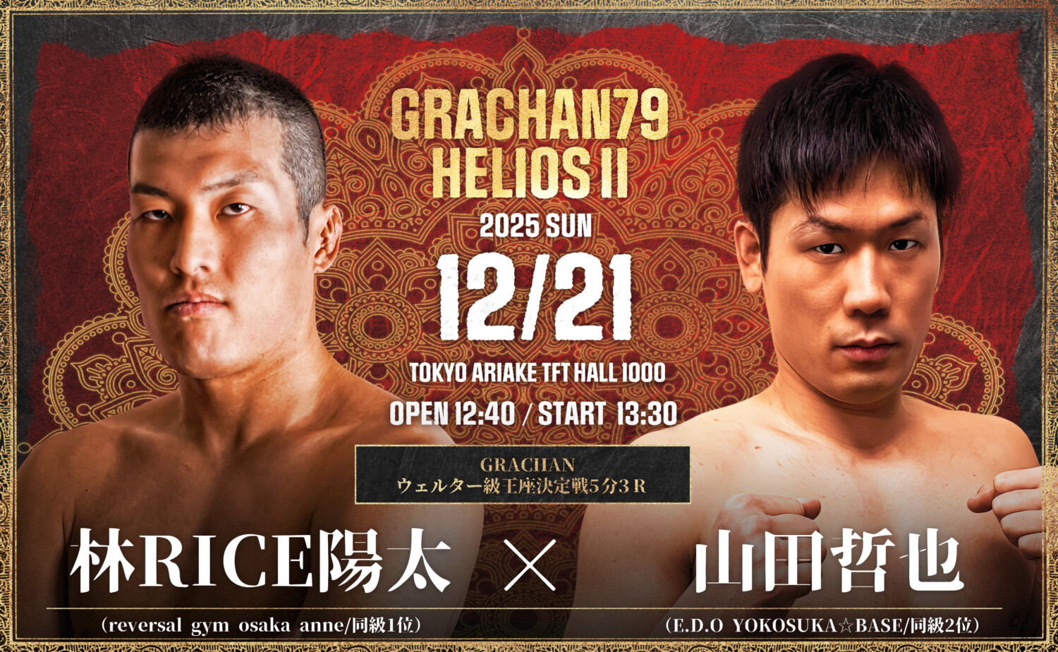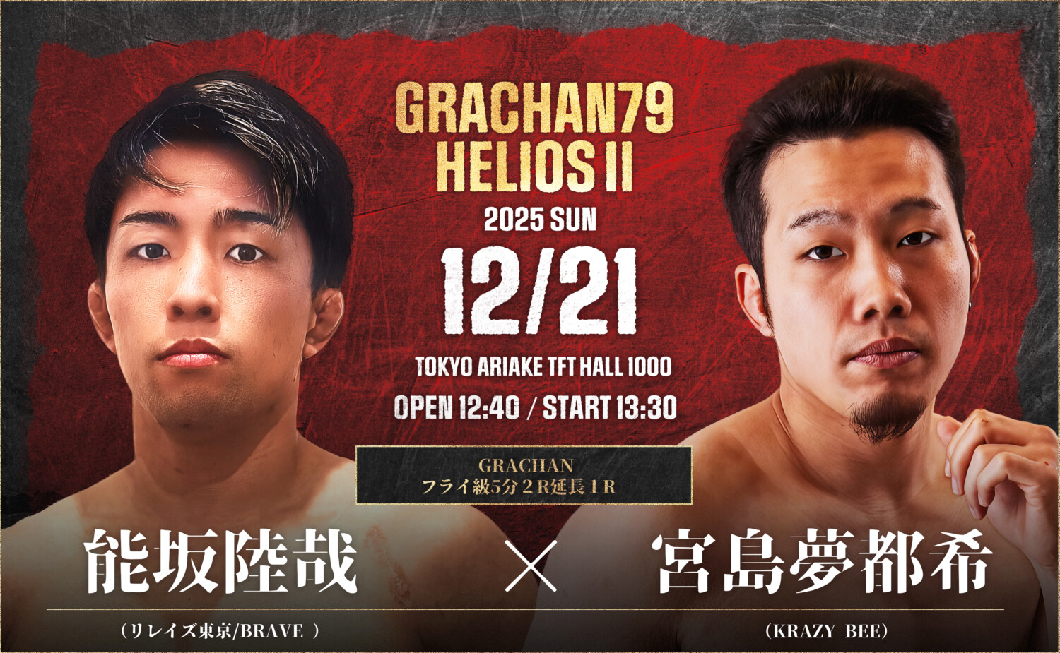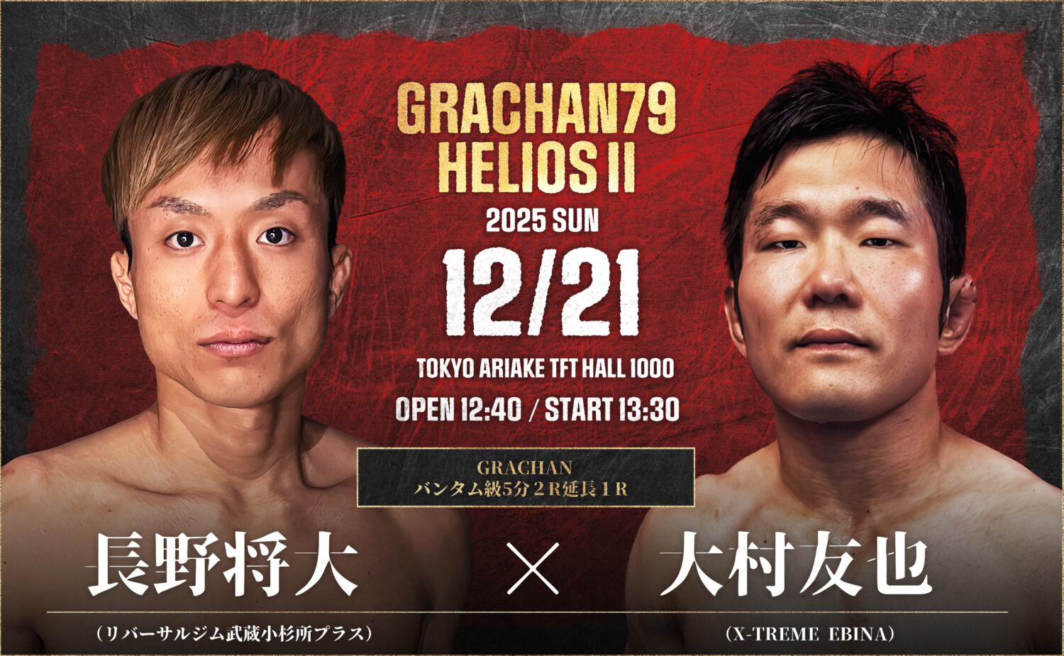 2025年12月21日(日)、東京・有明TFTホール1000にて「GRACHAN 79×HELIOS II」が開催される。今大会は――バンタム級王者・伊藤空也が、かつて自身からベルトを奪った手塚基伸と再び激突する「宿命のリマッチ」。そして、元ライト級王者・林“RICE”陽太が二階級制覇を懸けて挑む「ウェルター級王座決定戦」。二大タイトルマッチが並び立つ、GRACHAN年末の頂上決戦となる。(記事提供:GRACHAN事務局)