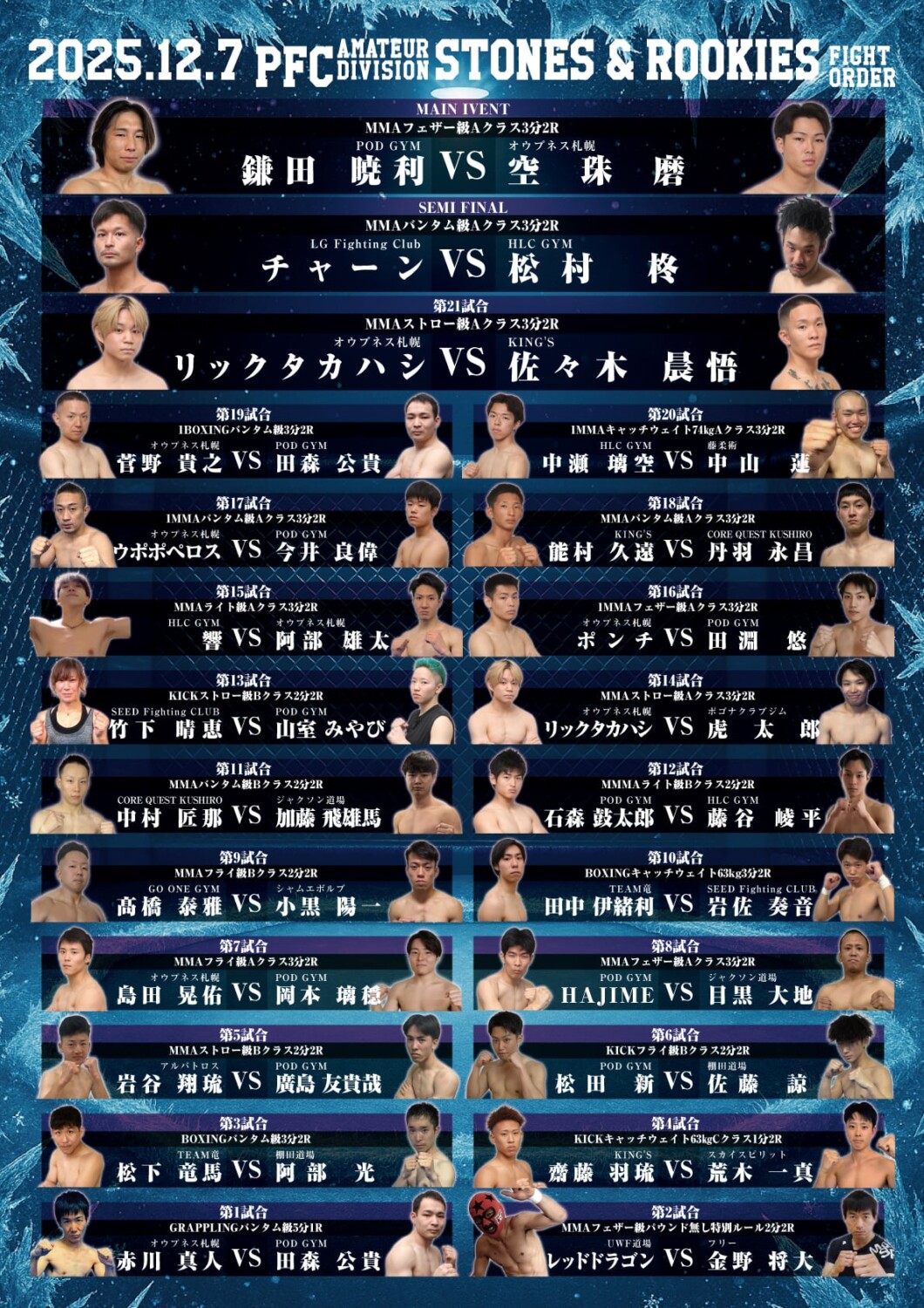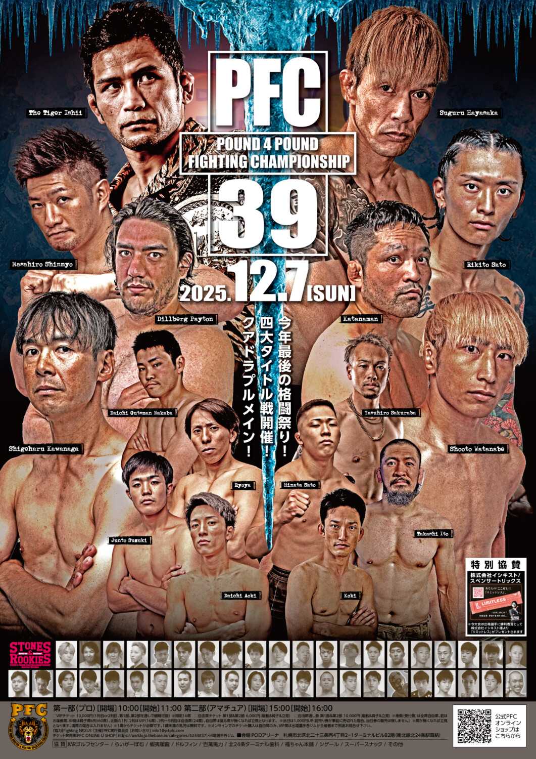 日時 2025年12月7日(日)第1部 PFC.39(プロ)開場 10:00 開始 11:00 / 第2部 STONES&ROOKIES(アマチュア)開場 15:00 開始 16:00
