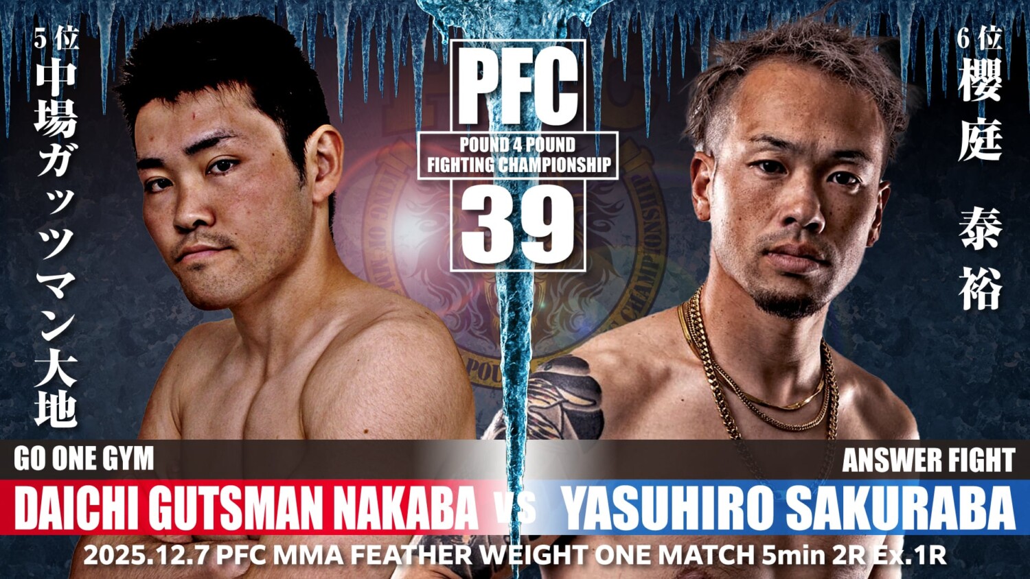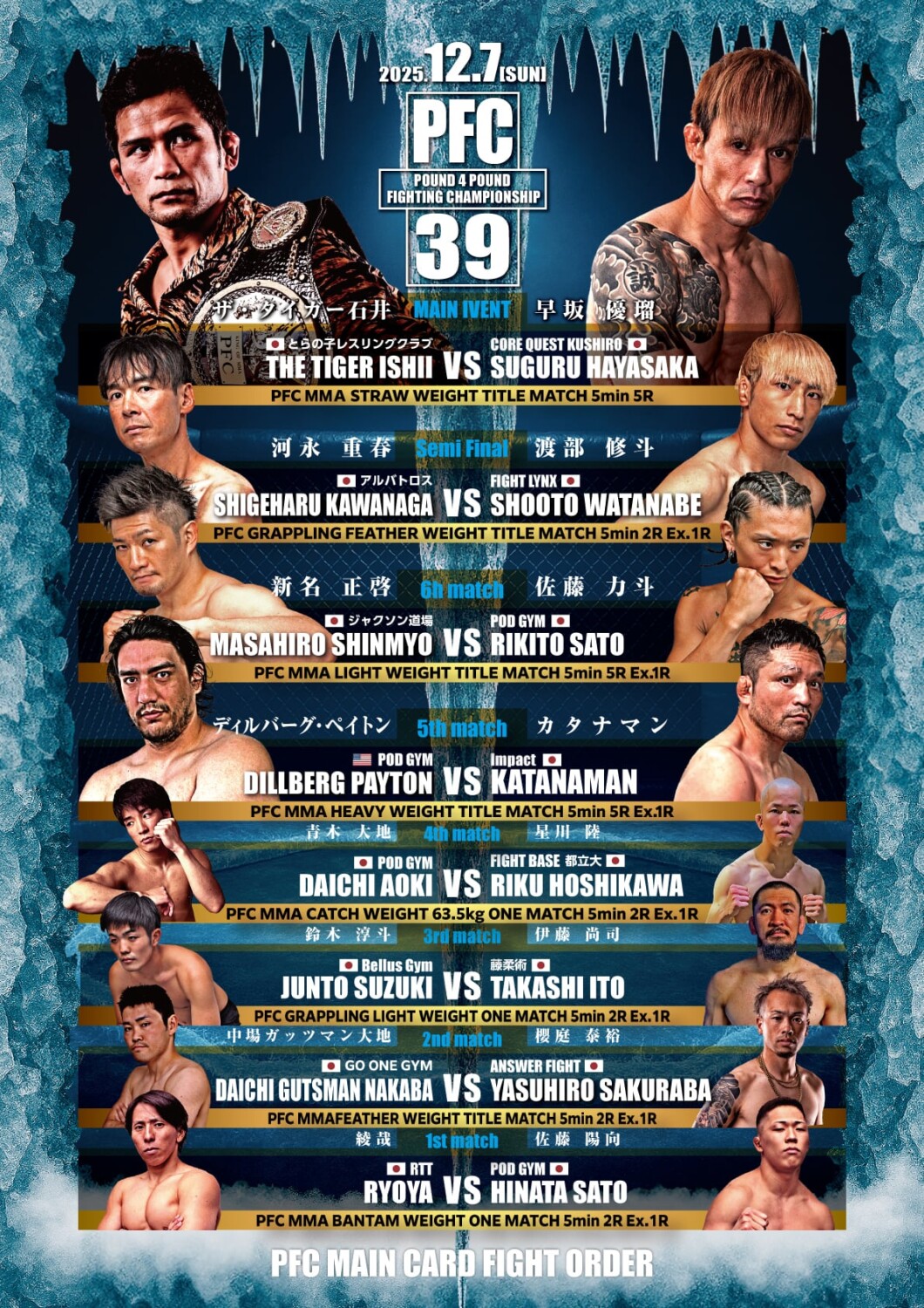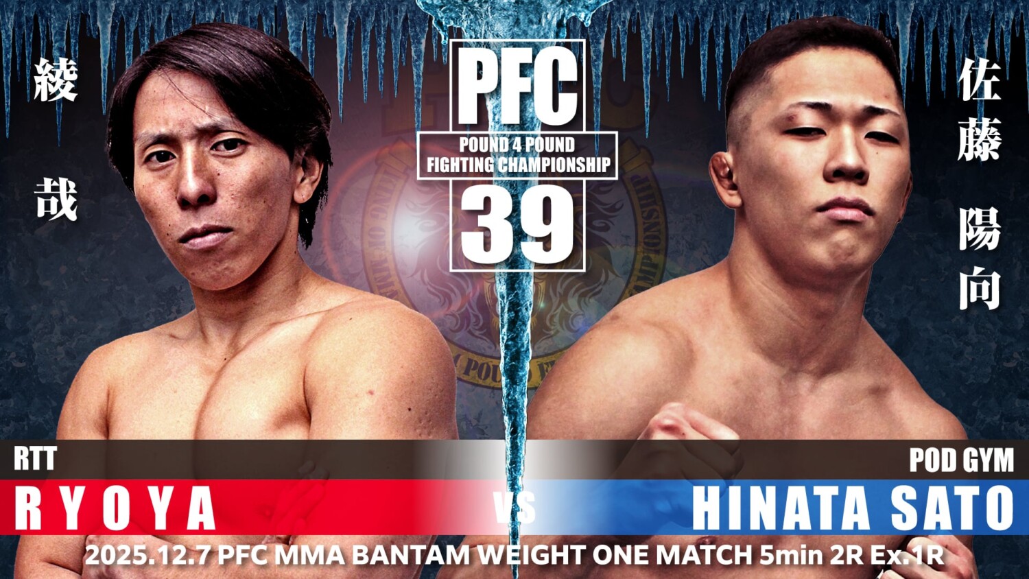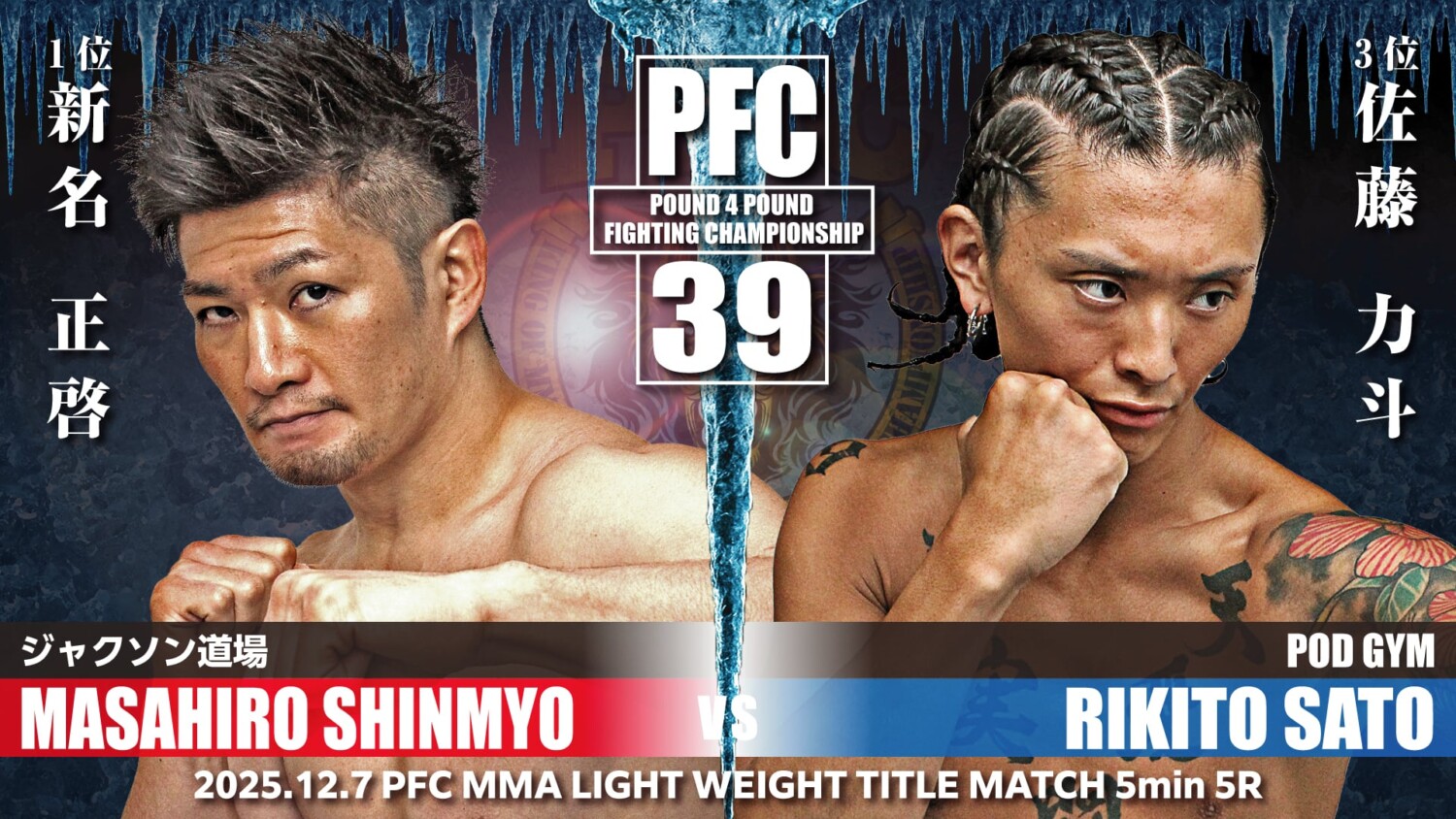 PFC.39(12月7日(日)札幌PODアリーナ)の全対戦カードが発表された。既報のとおりMMAストロー級&ヘビー級、グラップリング・フェザー級のタイトルマッチが決まっていたが、新たに新名正啓 vs. 佐藤力斗のライト級王座決定戦が加わり、2025年最後のPFCは4階級の王座戦が並ぶ。出場全選手のコメントが主催者から届いている。