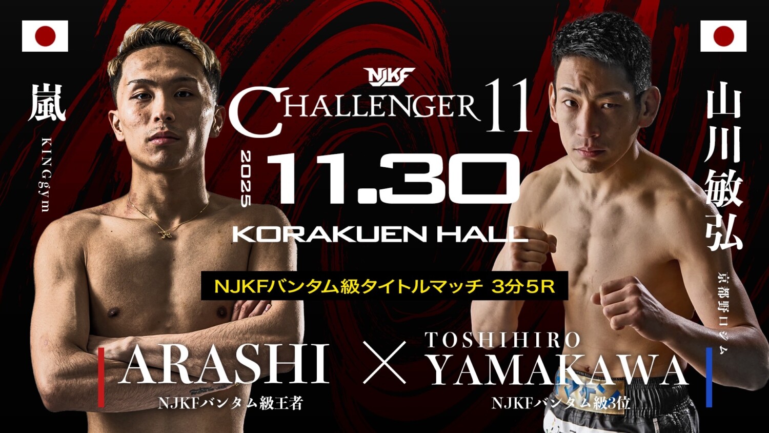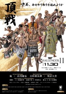NJKF×CHALLENGER 11(11月30日(日)後楽園ホール)の対戦カードが発表された。IBF(国際ボクシング連盟)が認定するムエタイの日本タイトルが新設され、スーパーライト級ではNJKF同級王者の吉田凜汰朗とINNOVATION王者の切詰大貴との間で初代王者決定戦が行われ、ウェルター級では4選手参加の初代王者決定トーナメント準決勝が行われる。NJKFバンタム級王者の嵐は同級3位の山川敏弘を相手に初防衛戦。長年NJKFの主力として活躍した38歳の健太は、佐々木勝海との126戦目をもって引退する。