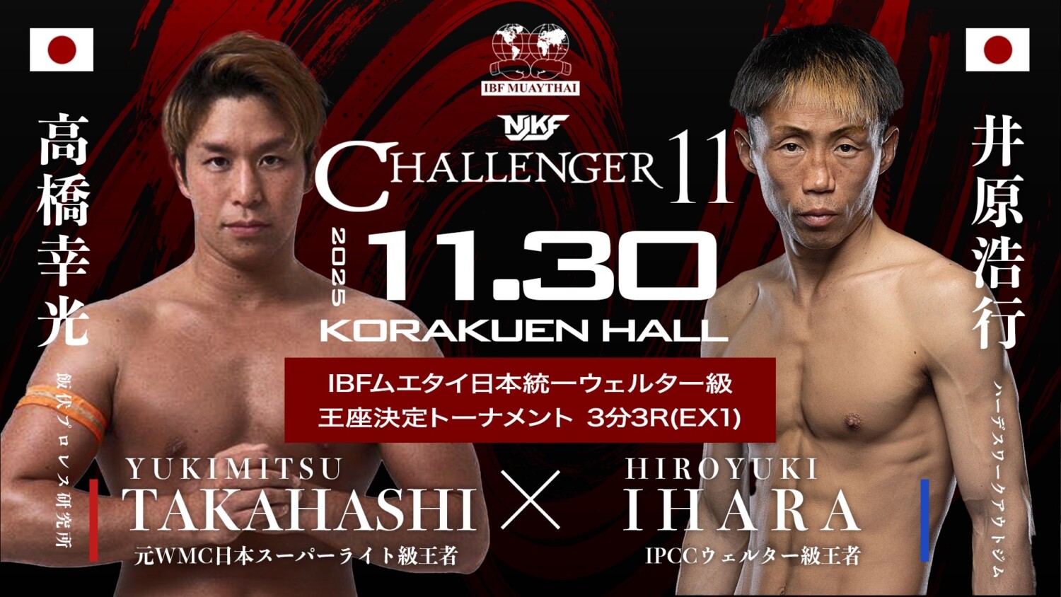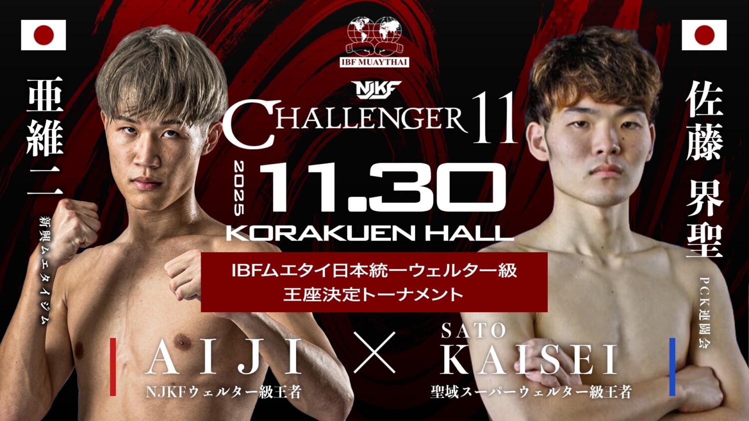 NJKF 11.30 後楽園ホール:吉田凜汰朗×切詰大貴でIBFムエタイ日本統一スーパーライト級王者決定戦。嵐が防衛戦。健太、126戦目で引退。紹介映像も公開