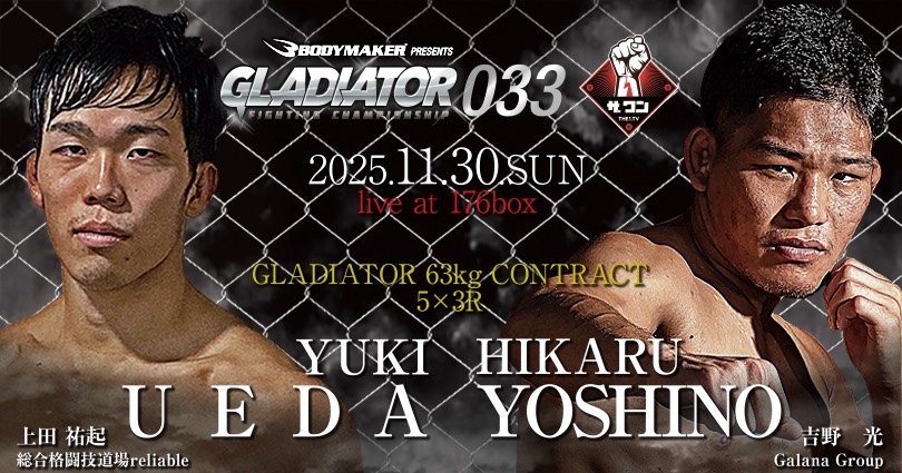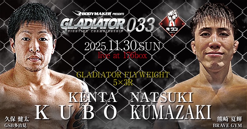 GLADIATOR 11.30 大阪 176BOX:久保健太、BRAVE新鋭 熊崎夏輝と対戦。吉野光、9年ぶり参戦し上田祐起と対戦