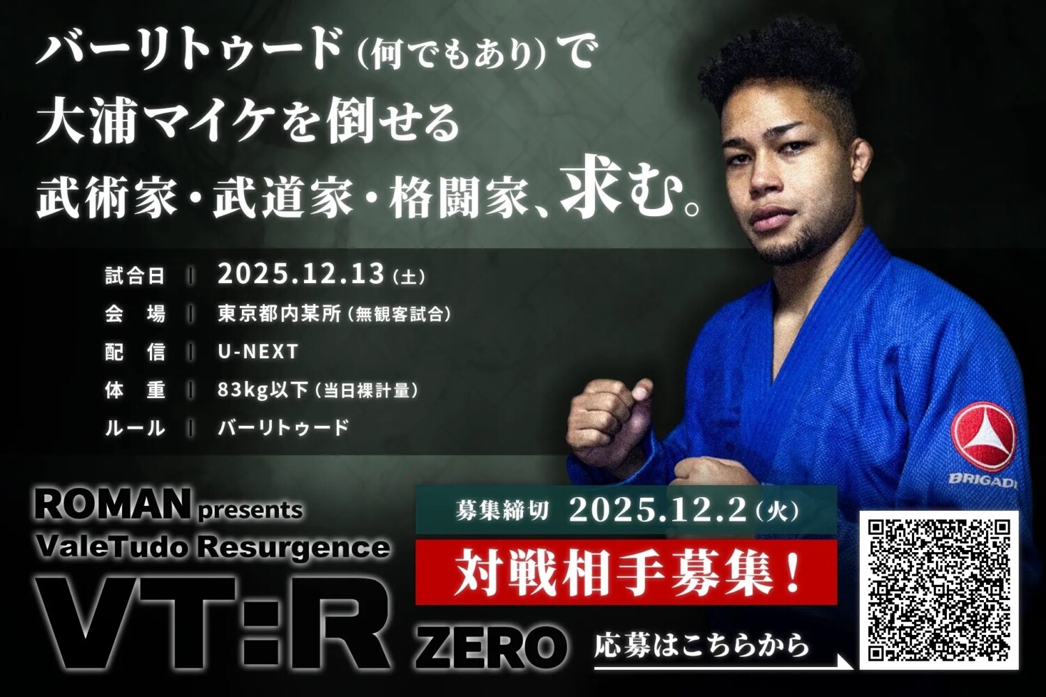 道着MMA、独自ルールのブラジリアン柔術、バーリトゥードマッチを実施している「ROMAN」が、バーリトゥードに特化した新シリーズ「VT:R ZERO(Vale Tudo Resurgence ZERO)」12月13日(土)に開催する。東京都内で開催するが無観客で、U-NEXTでのライブ配信限定となる。