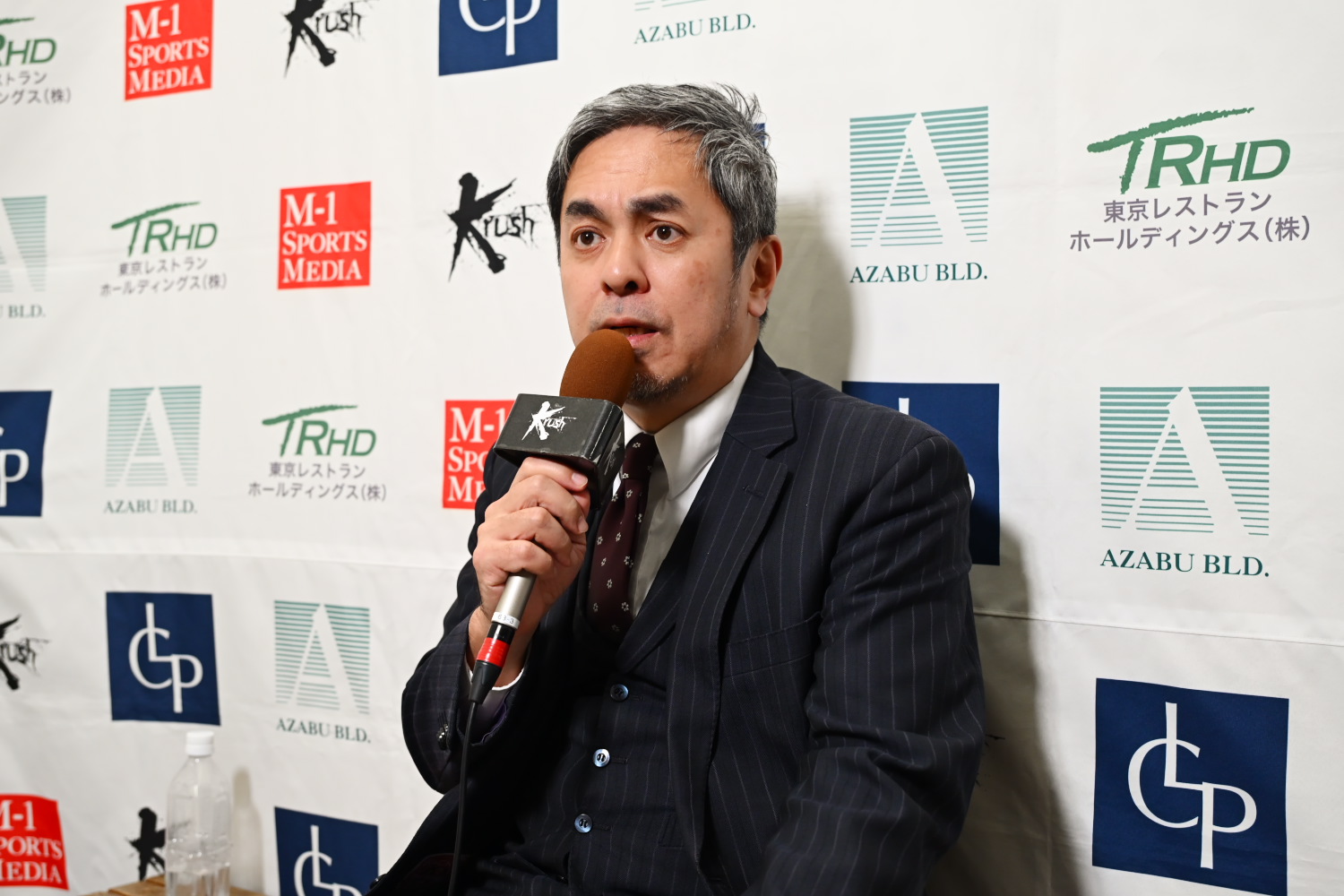 (大会後、須藤さんとお話は?)いや僕話してないんですよ。判定が多くて、KOが多かったら良かったんですけどね。週1で毎週会議で会いますし、それ以外でもコミュニケーション取ってるんですけど、1回Krushに来て欲しかったんですよ。今回来てくれたんで、そういうの(=感想)も含めて、来年の話を須藤プロデューサーとしていきたいですね。(須藤さんは)不思議なこと言うんで、楽しいんですけど。須藤さんはK-1を盛り立ててかなきゃいけないし、あの僕は僕でKrushの立場でどんどん選手作っていかなきゃいけないし、一緒に頑張っていこうと思いますね。