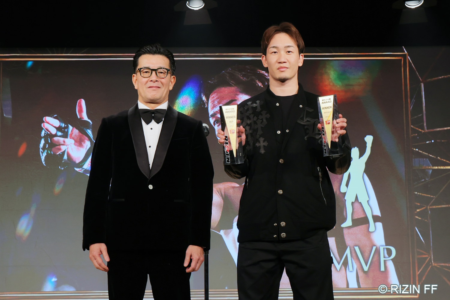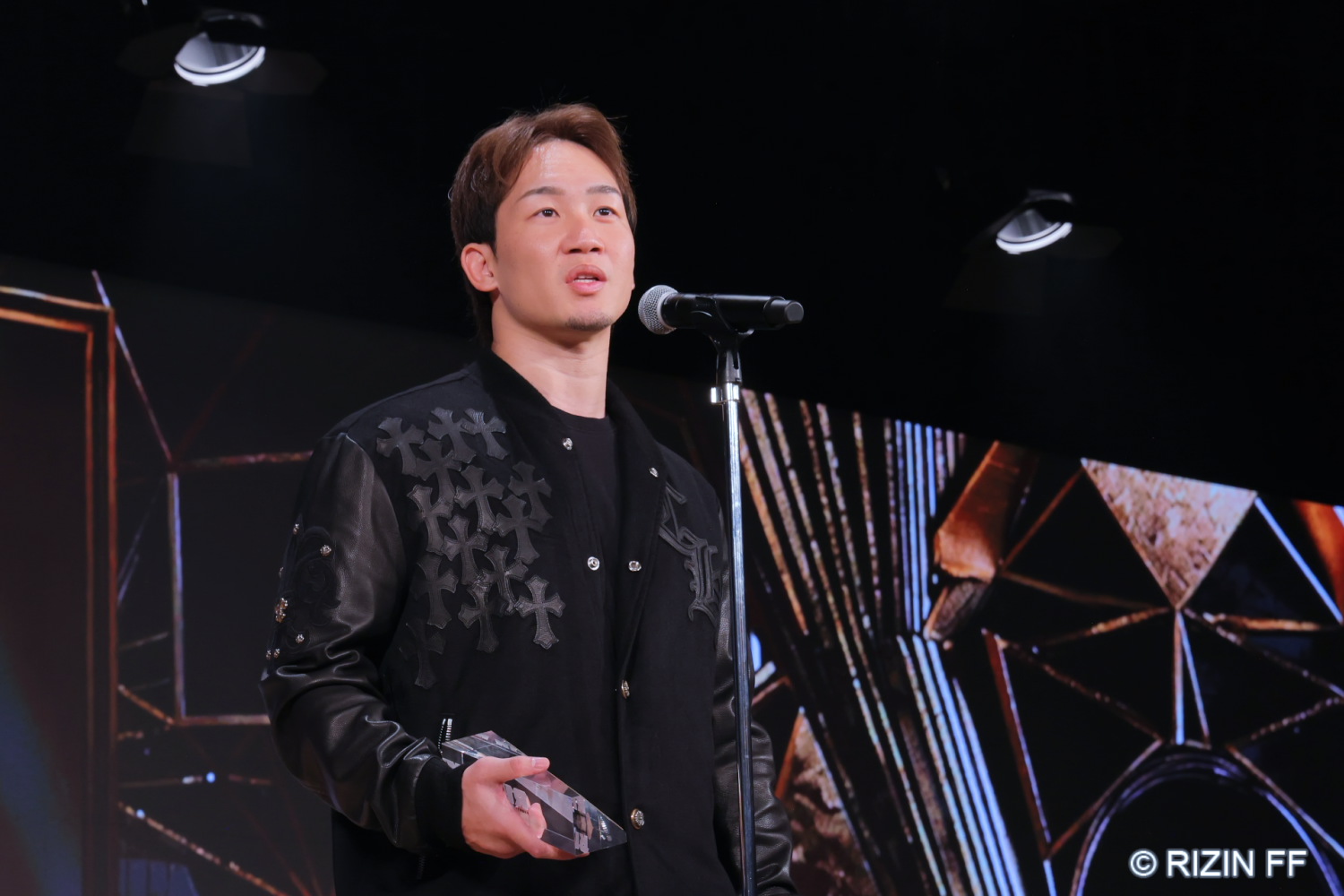 朝倉未来は「こんな素晴らしい会とは知らず、僕だけ私服で来てしまいました」と、カジュアル寄りの服装で来たことを反省して苦笑しつつ「(RIZIN)10周年ということで、僕たち兄弟って多分8年目ぐらいですかね。最初RIZINが始まった時はTHE OUTSIDERにいて、地上波ですごい大会やってるなって嫉妬して、出たいなっていう中で、ようやく出れて。で、出たはいいんだけど、総合格闘技の認知が世間であんまりなくて。で、YouTube始めて。こないだ数えたら18戦しているってことで、多分死ぬ時に思い返しても僕の青春だったなって思います。このMVPという素晴らしい賞をいただけて、とてもうれしいです。ありがとうございます」と、RIZINでの約8年を振り返り、感謝を述べた。