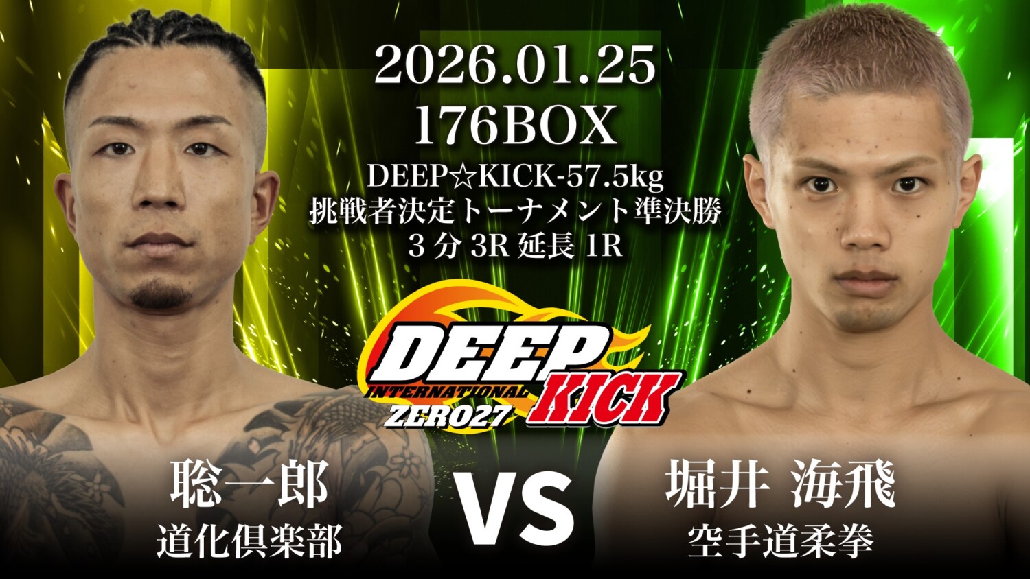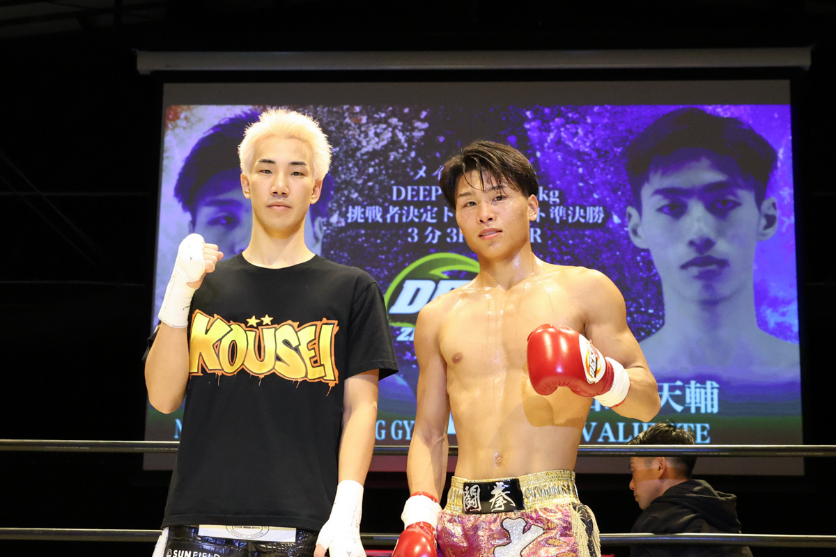 互いに11月に同級の上位ランカーを相手に確かな実力を見せつけ初のDEEP☆KICKトーナメント出場権を掴んでいる。聡一郎が9度目のKO勝利で決勝進出を決めるか、堀井が圧巻の攻勢で試合を支配するのか、緊張感あふれる1戦に期待してほしい。