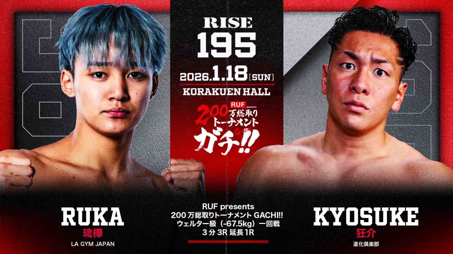 RISE 195(1月18日(日)後楽園ホール)で行われる4選手参加の1DAYトーナメント「RUF presents 200万総取りトーナメントGACHI!! ウェルター級(67.5kg)」の出場選手と組み合わせが発表された。