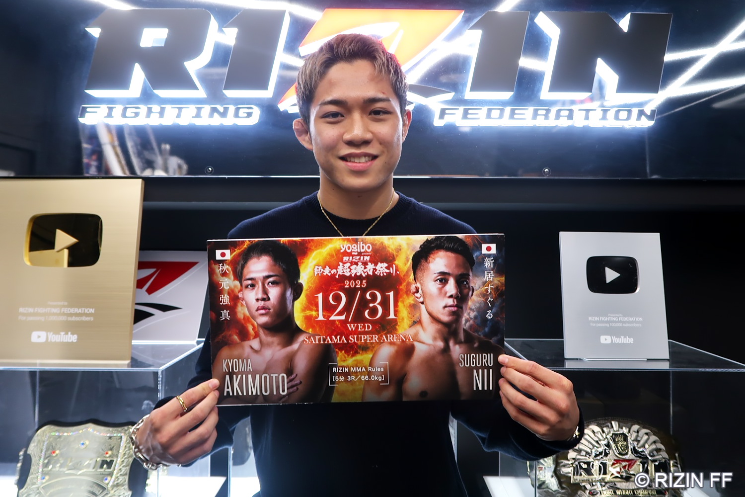 すると秋元強真が夕方「榊原社長、インスタライブ見ました。新居すぐる選手の相手決まってないんですよね?自分全然行けますよ!」とXにポストする。榊原氏は「強真、気持ちは嬉しいけど、さすがに難しいんじゃないの?」と返すと、秋元は「神戸が終わった時は今年はゆっくりしようと思いましたけど、やっぱ闘いたいなって。怪我も治ってます!」と答え、夜10時過ぎに榊原氏は「正直、想定していた選手がみんなダメになってしまっていたので….じゃぁ一度オフィスでミーティングしよう!」と呼びかけ、秋元は「この後お邪魔します」と即答し、翌19日夕方、秋元と新居の対戦が発表された。