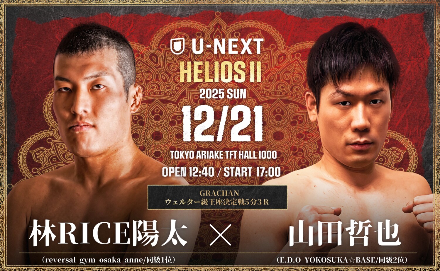GRACHAN 12.21 TFTホール1000:HELIOS IIをU-NEXTで生中継。バンタム級王者 伊藤空也「4年間の練習の答え合わせを」×挑戦者 手塚基伸「伊藤君が作ってくれたストーリーとベルトで格闘技に戻れた」。ウェルター級王座決定戦 林RICE陽太×山田哲也 談話も