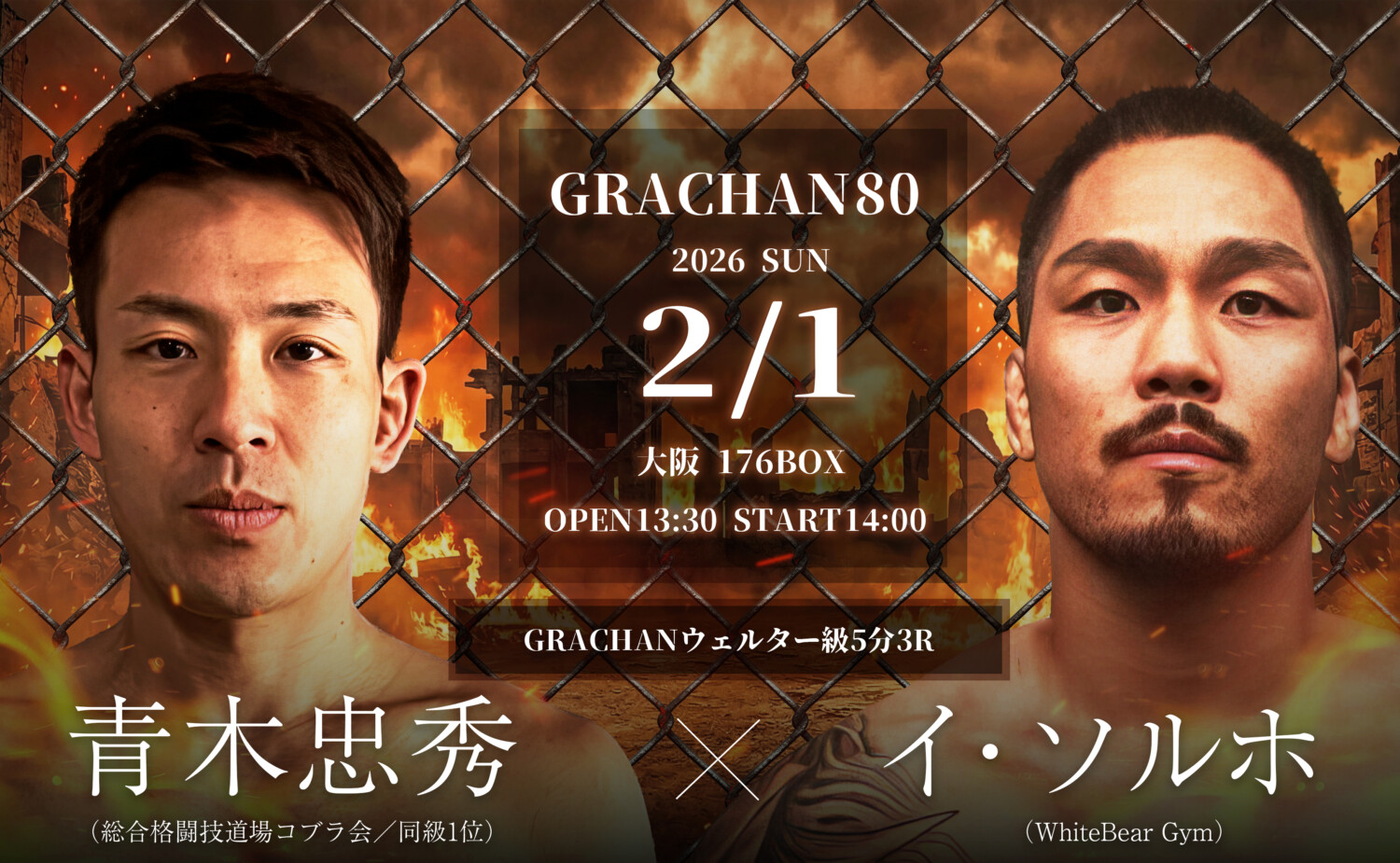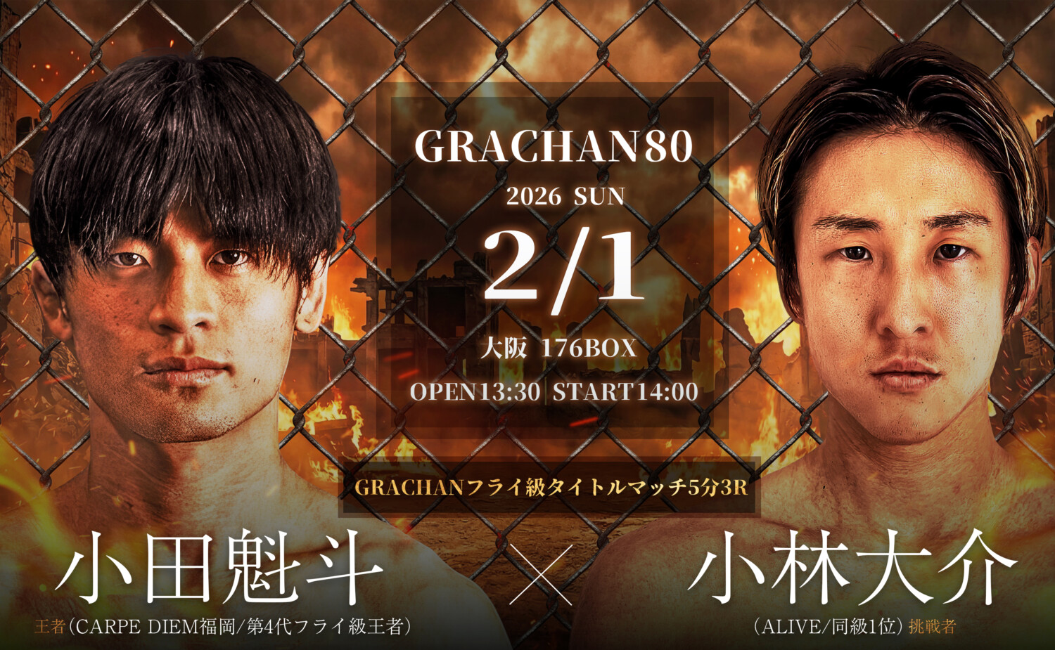 GRACHAN 80(2月1日(日)大阪・176BOX)の対戦カード発表された。記念すべき80回記念大会となる今大会のメインイベントでは、第4代GRACHANフライ級王者・小田魁斗(CARPE DIEM福岡)が1位の小林大介(ALIVE)を相手に初防衛戦を行う。