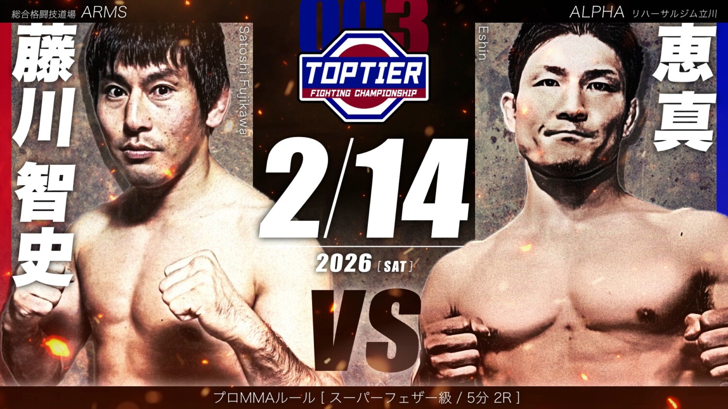 アマチュア主体のMMA大会「TOPTIER 003」(2月14日(土)高知県須崎市 オリーブホーム)で、今回はプロの試合が行われる。愛媛県今治市在住の37歳のベテラン・藤川智史(ARMS/2015年修斗フェザー級新人王)と、須崎の明徳義塾中学出身(野球部在籍)の恵真(リバーサルジム立川ALPHA/2024年修斗フェザー級新人王トーナメント準優勝)がフェザー級で対戦する。藤川は18年4月に修斗香川大会で福田龍彌と対戦し3R判定勝ちした実績もある。両選手とも昨年のプロ修斗での前回の試合では黒星を喫しており、ここで勝って再浮上を目指す。