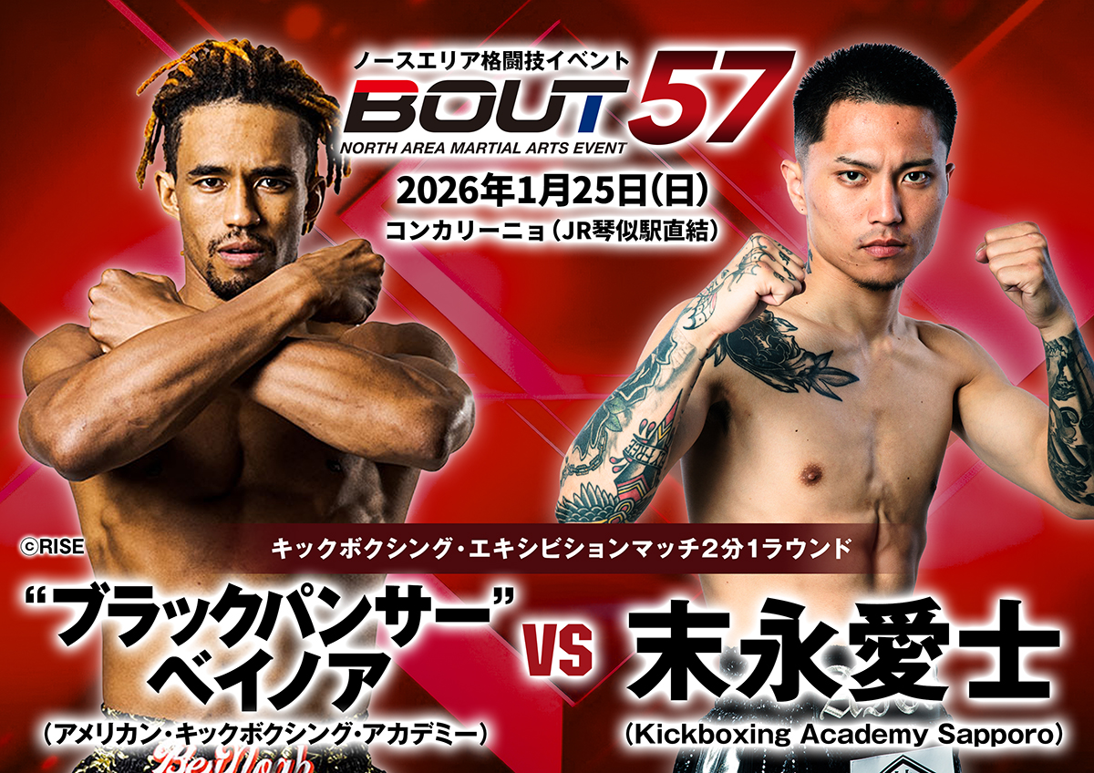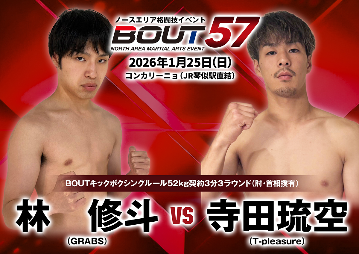 1月25日(日)札幌・コンカリーニョ(JR琴似駅直結)にて開催されますノースエリア格闘技イベントBOUT57の全対戦カードが決定致しましたのでお知らせ致します。(記事提供:BOUT実行委員会)