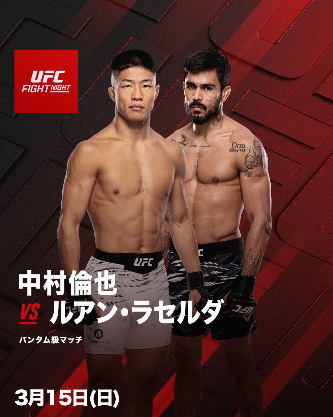 UFC Fight Night(3月14日(土/現地時間)米国ラスベガス・Meta APEX)に中村倫也が出場し、ルアン・ラセルダ(ブラジル)と対戦することが発表された。なお、Facebookを運営する米国のメタ・プラットフォームズ社がUFC APEXの命名権を獲得し、「Meta APEX」に会場名が変わったことが、1月14日(現地時間)に発表されている。