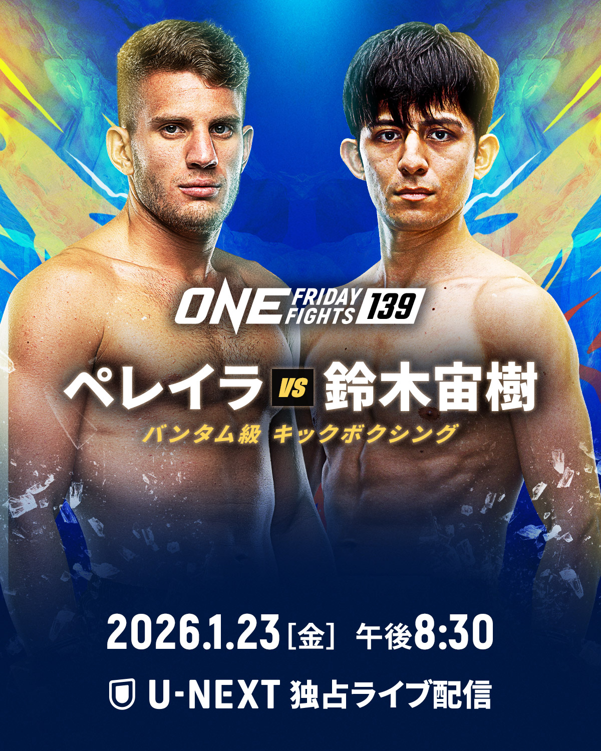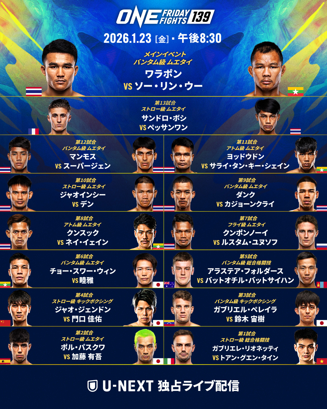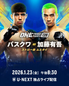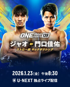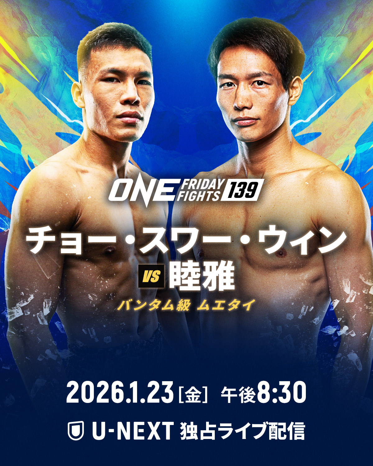ONE Friday Fights 139(1月23日(金)タイ・バンコク:ルンピニースタジアム)に、日本から睦雅、門口佳佑、鈴木宙樹、加藤有吾の4選手が参戦することになった。大会の模様はU-NEXTにて同日夜8時30分より生中継される。