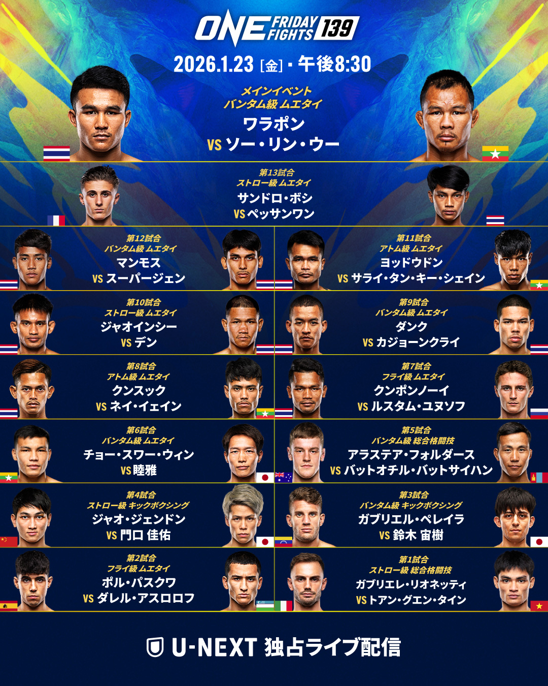 ONE Friday Fights 139(1月23日(金)タイ・バンコク:ルンピニースタジアム)に日本から参戦する睦雅、門口佳佑、鈴木宙樹のインタビューがONEから届いた。出場予定だった加藤有吾だがメディカルチェックを通過できず欠場する。