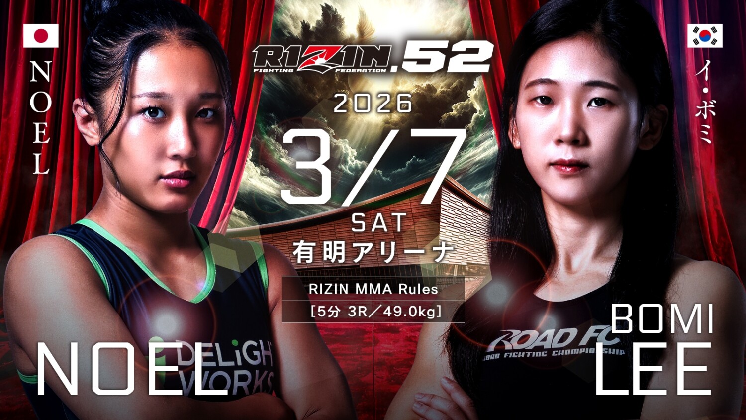 NOELは17歳。小学生時代にムエタイを習い、12歳からMMAをはじめ、24年修斗でプロデビューし4戦2勝2敗。RIZIN甲子園のスポンサーでもあるDELiGHTWORKSから支援を受け、昨年7月の超RIZIN.4でRIZINに初参戦したが、須田萌里に2Rアームロックで一本負け。11月の名古屋大会のオープニングファイトでは海咲イルカに2R腕十字で一本勝ちした。