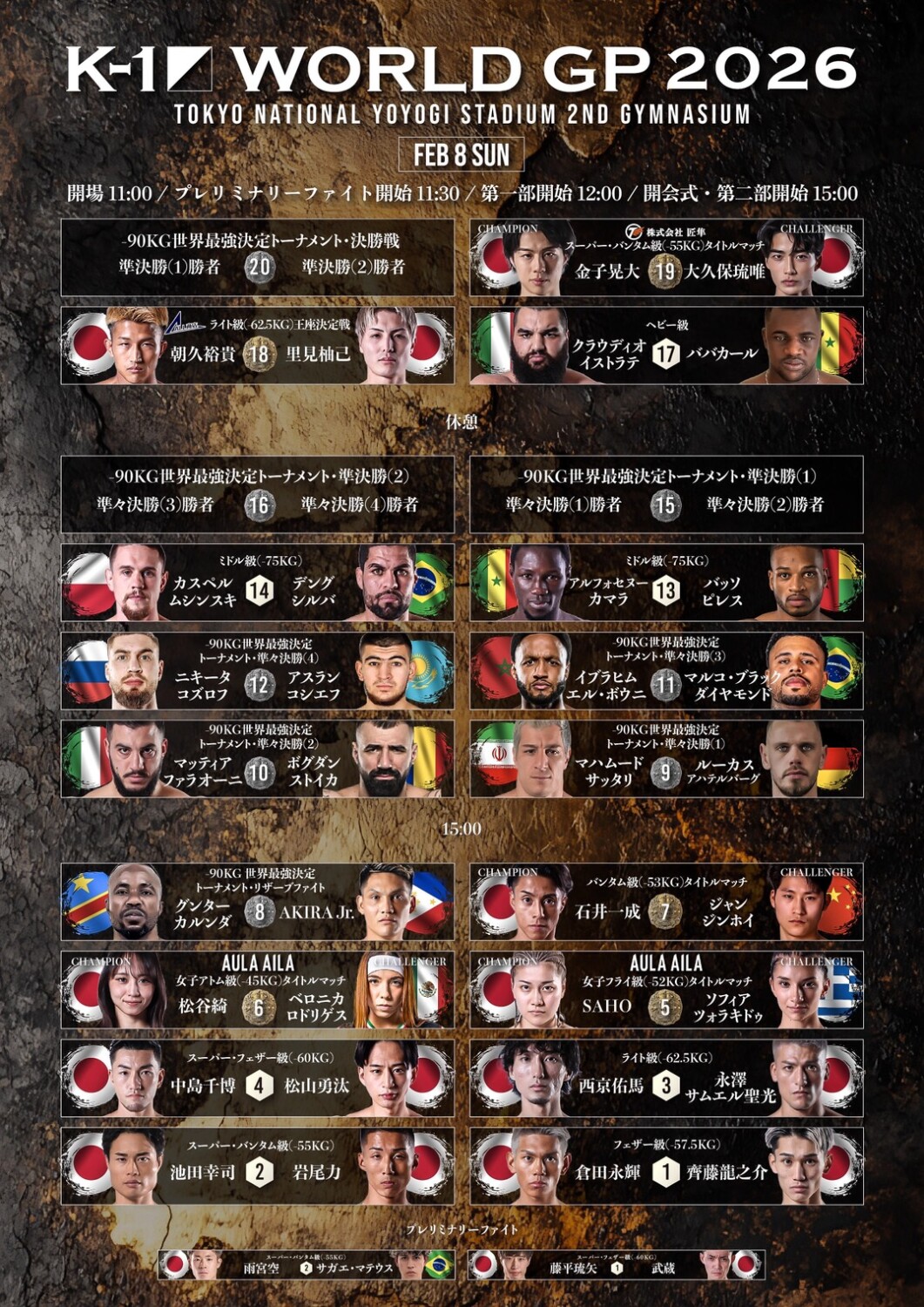 来る2月8日(日)、東京・国立代々木競技場第二体育館で開催される「K-1 WORLD GP 2026~ -90kg世界最強決定トーナメント~」の全試合順が決定しました。
