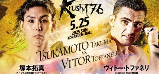 塚本は28歳。24年、拳成の弟・魁成、不可思に判定勝ちしたが、ゴンナパー、佐々木大蔵に判定負け。昨年4月29日のKrushでは岩﨑悠斗を2R KO。自ら志願し1か月弱先の5月25日のKrushに出場しヴィトー・トファネリに3R左ローでKO負けした。