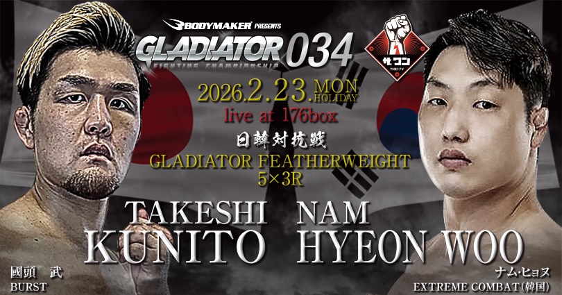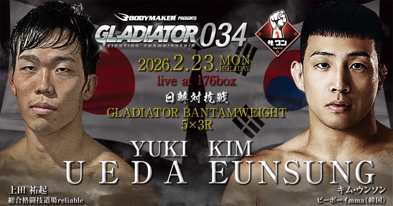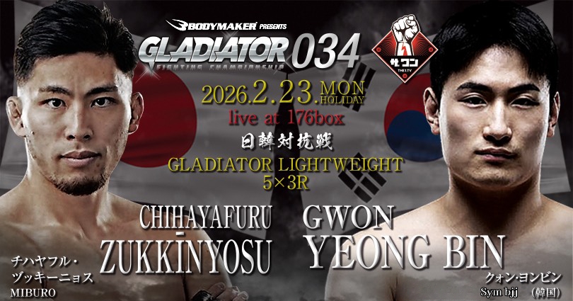 GLADIATOR 034(2月23日(月/祝)大阪・176BOX)の第1弾決定カードとして、GLADIATORの上位勢と韓国勢の対抗戦3試合が組まれた。GLADIATORから各試合の紹介と選手のコメントが届いている。