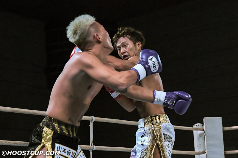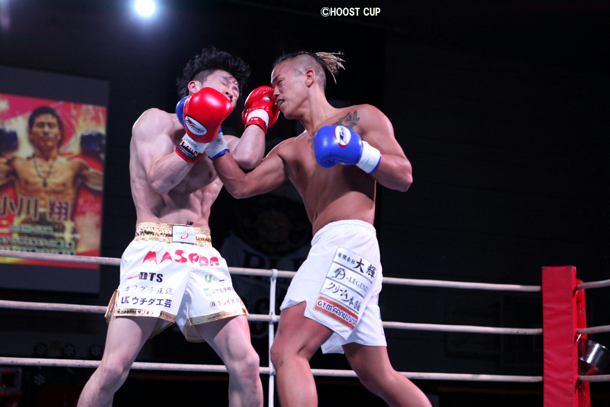 2R、小川のガードの隙間を縫うように山口の強打が入り、小川の顔が紅潮するが、打たれ強い小川は冷静にテンカオ、ローを叩き込み、打ち合いのなかで小川の蹴りに山口の体が流れ出す。山口も負けずに回転の速いパンチで反撃する。