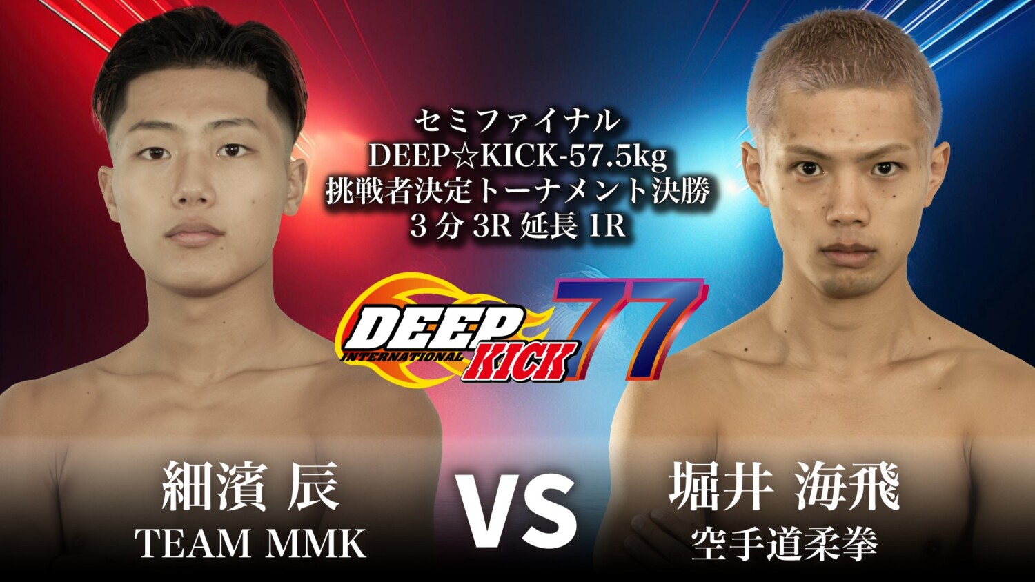 続くは昨年9月にDEEP☆KICK-57.5kg第6代王者となった戦闘員1号(SHOCKER☆EXARES)への挑戦権を懸けたDEEP☆KICK-57.5kg挑戦者決定トーナメント決勝戦、同級1位の細濱辰(TEAM MMK)と先日25日に行われた準決勝を3RTKOで制した堀井海飛(空手道柔拳)が激突する。両者は昨年11月に対戦したばかりであり、その際は近距離でのパンチの交差が繰り広げられる好ゲームとなるも堀井が有効打による出血でドクターストップ、細濱が3RTKO勝利となっている。