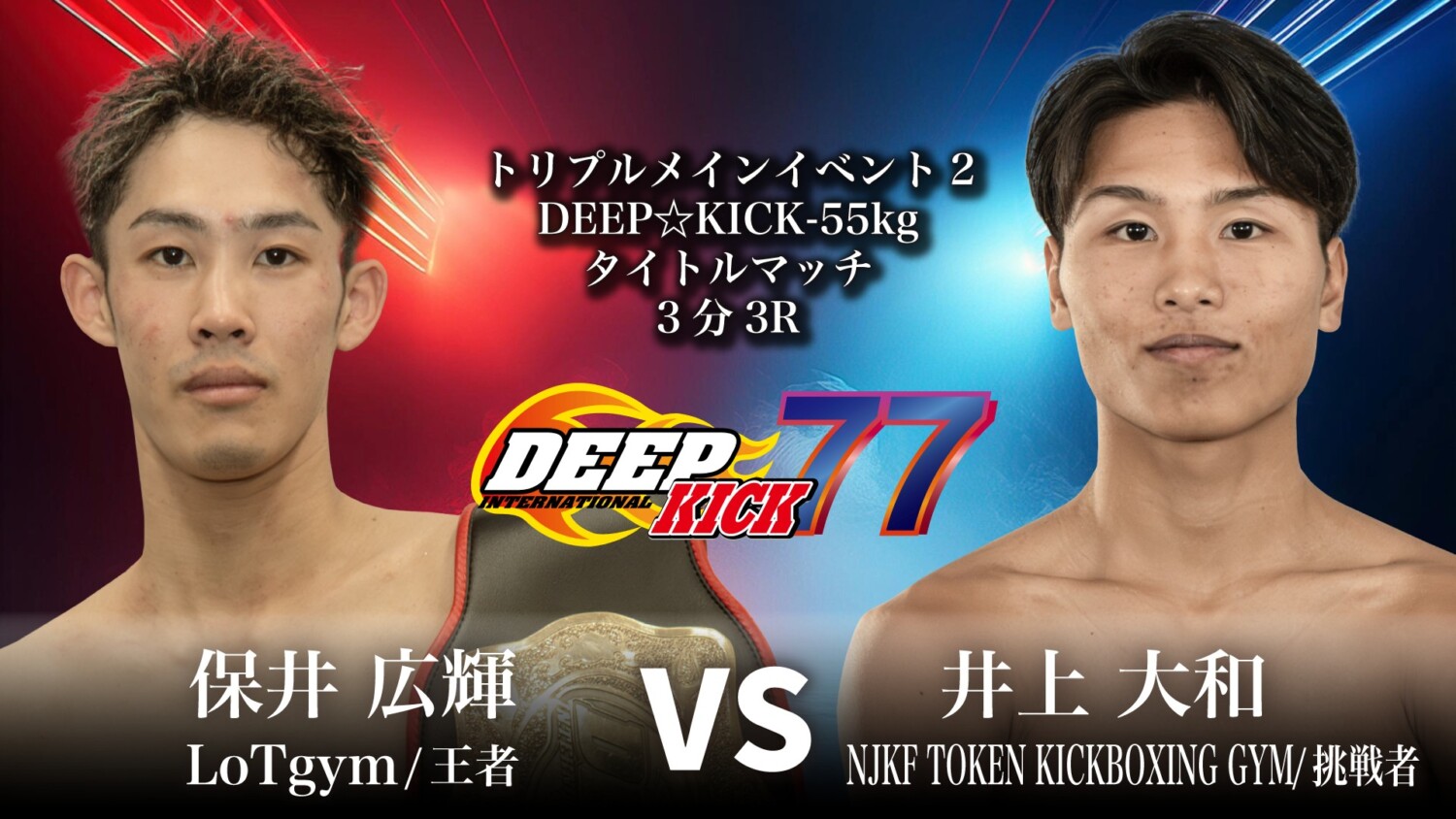まずは昨年6月にDEEP☆KICK-55kg第5代王者に輝いた保井広輝(LoTgym)の初防衛戦として、昨年11月より始まった挑戦者決定トーナメントを制した井上大和(NJKF TOKEN KICKBOXING GYM)と対戦が決定。