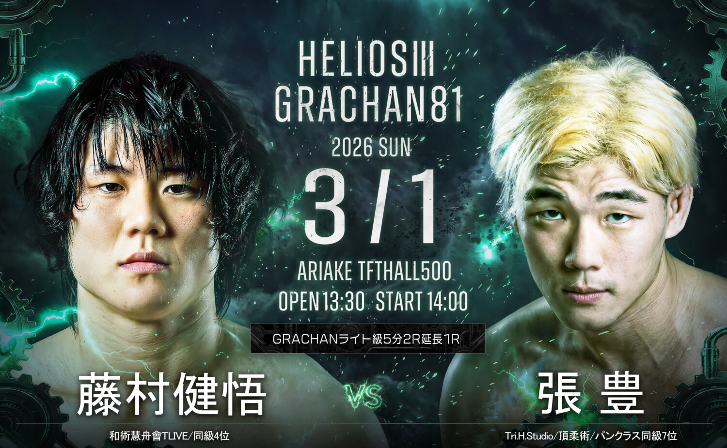 対するは、今回がGRACHAN初参戦となる張豊。Tri.H.Studio/頂柔術所属の張は、パンクラス・ネオブラッドトーナメント(ライト級)を制し、同級7位にランクインしている実力者だ。確かな柔術テクニックと極めの強さを武器に、新たな戦場へ乗り込む。
