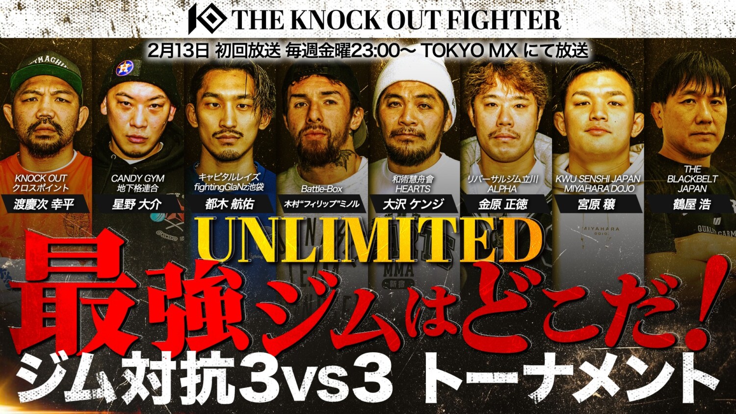 KNOCK OUTが「新たな格闘技界のスターを発掘する」ことをテーマに制作している格闘ドキュメンタリー番組「THE KNOCK OUT FIGHTER」の第7弾シリーズの放送が、2月13日(金)より始まる。今シリーズは「UNLIMITED最強ジムはどこだ!ジム対抗3vs3トーナメント」と題し、8つのジム・チームが3対3の勝ち抜き戦で優勝を争う。