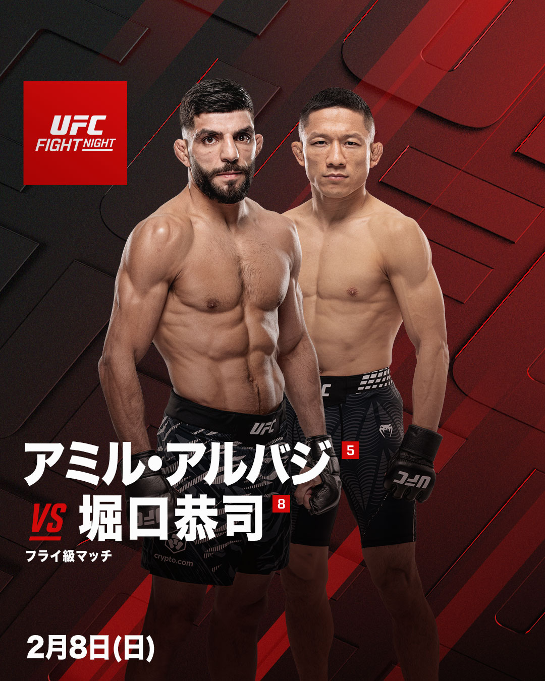 堀口は昨年11月、UFCに9年ぶりに復帰し、タギル・ウランベコフに3R裸絞めで一本勝ち。UFCフライ級ランキングに復帰し、約2か月半という短い間隔で早くも次の試合、アミル・アルバジ戦に臨む。