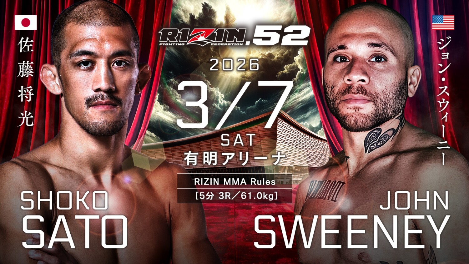 RIZIN.52(3月7日(土)東京・有明アリーナ)の追加カード2試合がが2月5日に発表された。1週間前の記者会見での予告通り、伊藤裕樹と佐藤将光の対戦相手が発表され、いずれもUFCに多数の選手を送り込んでいる米国のLFA(Legacy Fighting Alliance)の元王者となった。これで全カード決定で、13試合となっている。