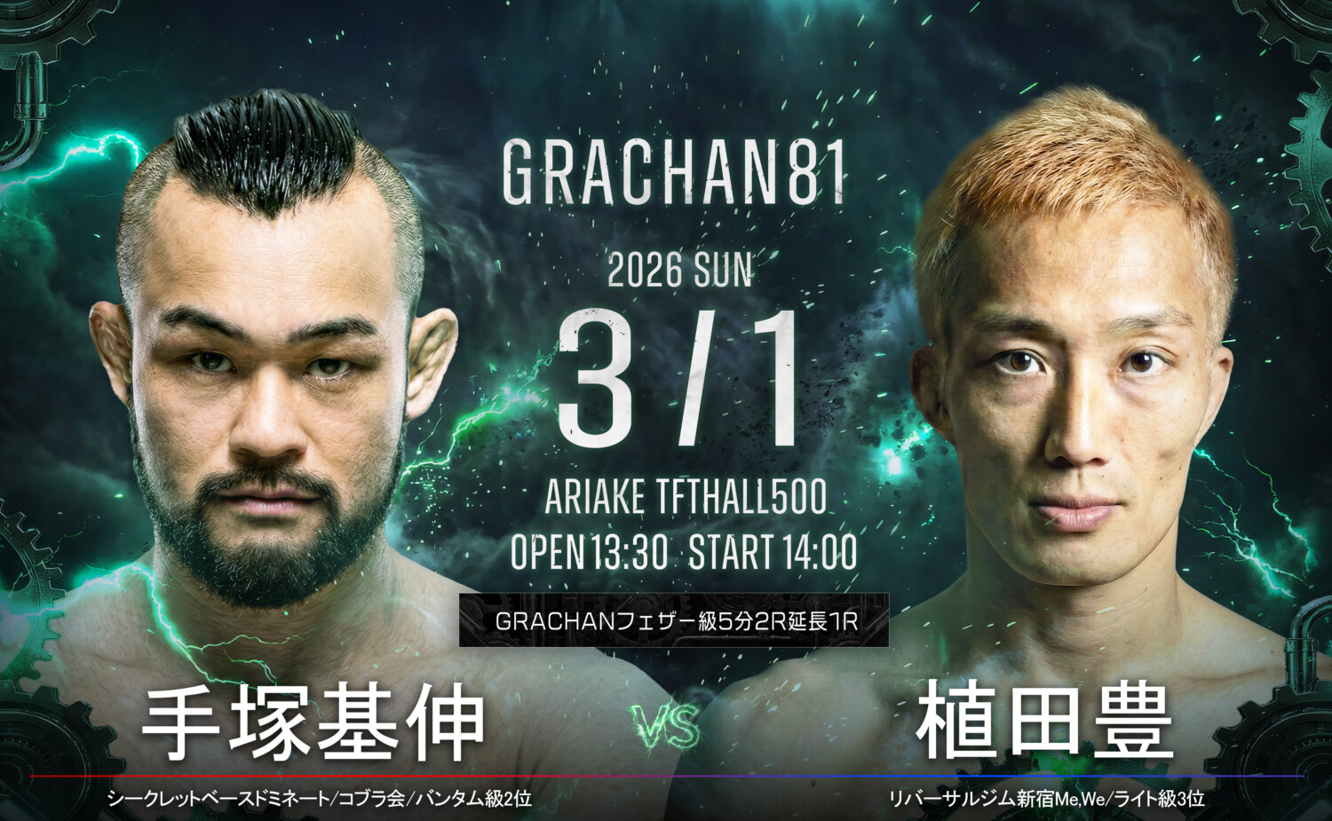 Helios III & GRACHAN 81(3月1日(日)東京・有明TFTホール500)で、元GRACHANバンタム級王者の手塚基伸がフェザー級に階級をアップし、逆にライト級からフェザー級に階級を下げる植田豊と対戦することになった。これで全カードが決定し、試合順も発表されている。