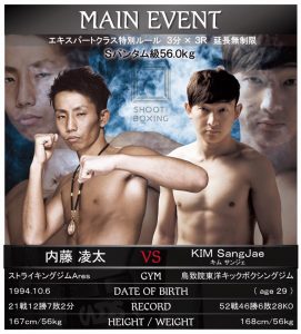 当初、メインイベントではSB日本スーパーバンタム級4位・内藤凌太(ストライキングジムAres)が韓国のイム・スンチャン(MAXFC/鳥致院東洋キックボクシングジム)と対戦する予定だったが、スンチョンがケガにより欠場。スンチョンの代役としてキム・サンジェ(韓国)が出場する。