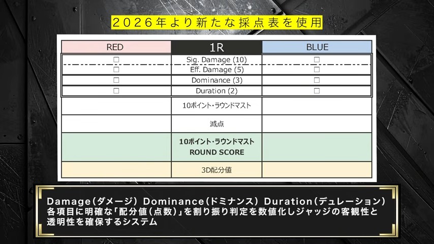 新しいルールの「デュアル・マストシステム」は、今世界的に普及している10点法で採点する「10ポイント・ラウンドマスト」をまず第一基準にしまして、そこにRIZIN独自の「3Dトータルマスト」を第二基準として統合した二層式の判定システムになります。今までもラウンドごとに採点して同点だったらトータルマストでというのは、DEEPでも同じようなことをやっていたことがあるんですけども、ただ少しそことも違う形でやらせていただこうと思っております。