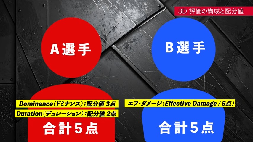 最後のデュレーションにつきましては、ドミナンスやダメージを与え続けた時間の長さや割合を評価する項目で、ここは最終的にどんなに僅差であっても必ず白黒つけて、配分値としては2点という形になっています。