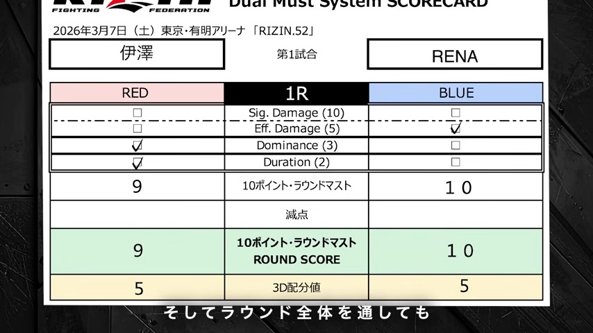 また動画の後半では、実際の試合の攻防を具体例にあげ、どう採点するかという説明が行われた。昨年大晦日の伊澤星花 vs. RENAの1R目(序盤に伊澤がダウンしたが、終盤に寝技で挽回した)の3D評価の説明がなされた。22年大晦日の扇久保博正 vs, 堀口恭司の3R目で、両者寝技で優位なポジションを取り合った後、堀口の膝蹴りで扇久保がカットし、深刻なダメージとは言い難かったが、JMOCの石川喬也氏は「RIZINの新システムでは、ダメージ、ドミナンス、デュレーションの全てにおいて明確な優位性が見出され、スコアが10点相当に達した場合、10対8を検討していこうと考えています」と話しており、実運用でどの程度10-8がつくケースがあるのか今後見定めていく必要があるだろう。