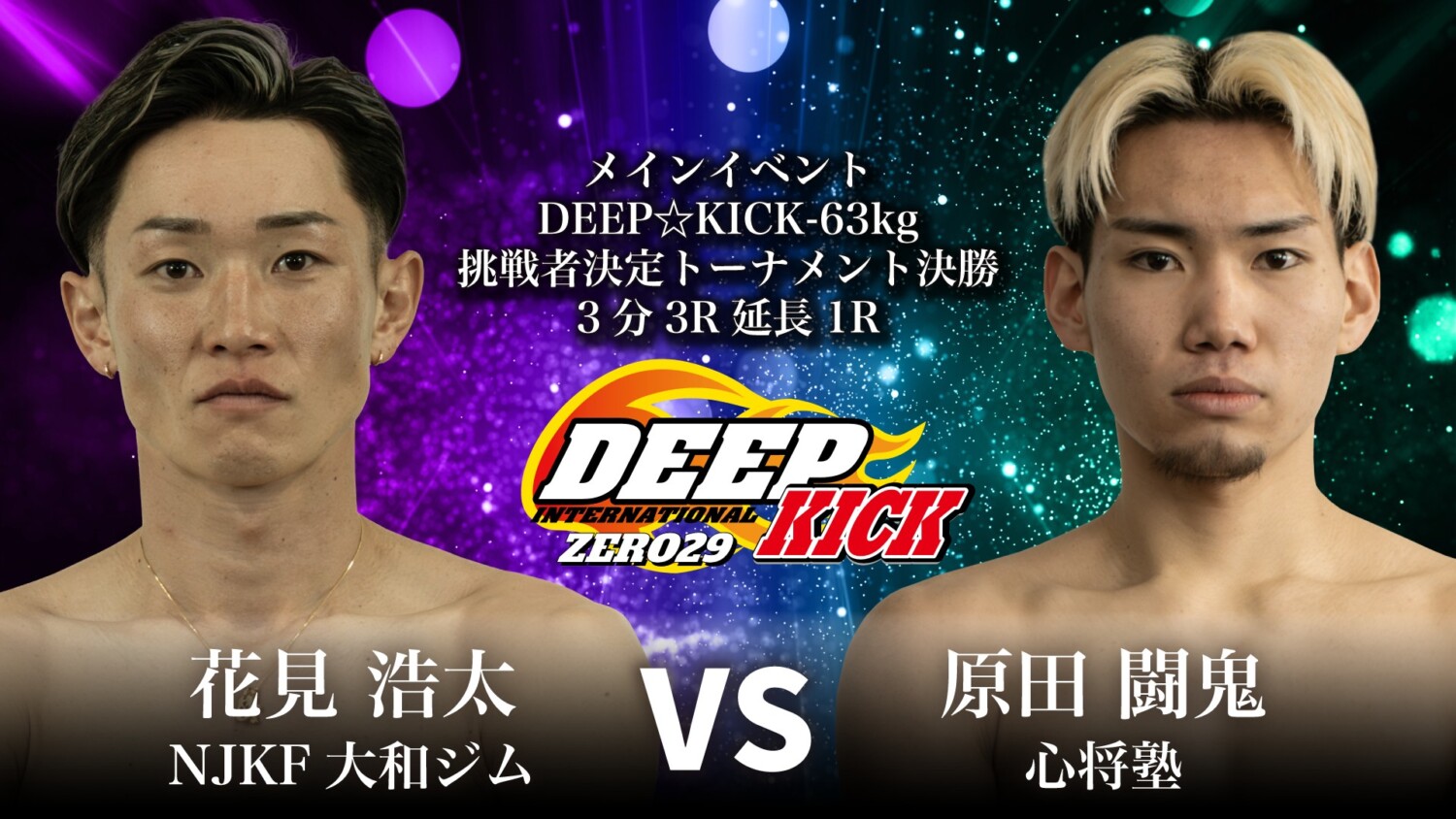 続くは第2部『DEEP☆KICK ZERO 29』、昨年9月に初防衛を飾ったDEEP☆KICK-63kg第7代王者である吉岡龍輝(及川道場)への挑戦権を懸けたトーナメントの決勝戦、同級1位の花見浩太(NJKF大和ジム)と1月の準決勝をTKOで制した原田闘鬼(心将塾)がタイトルマッチへの切符を奪い合う。