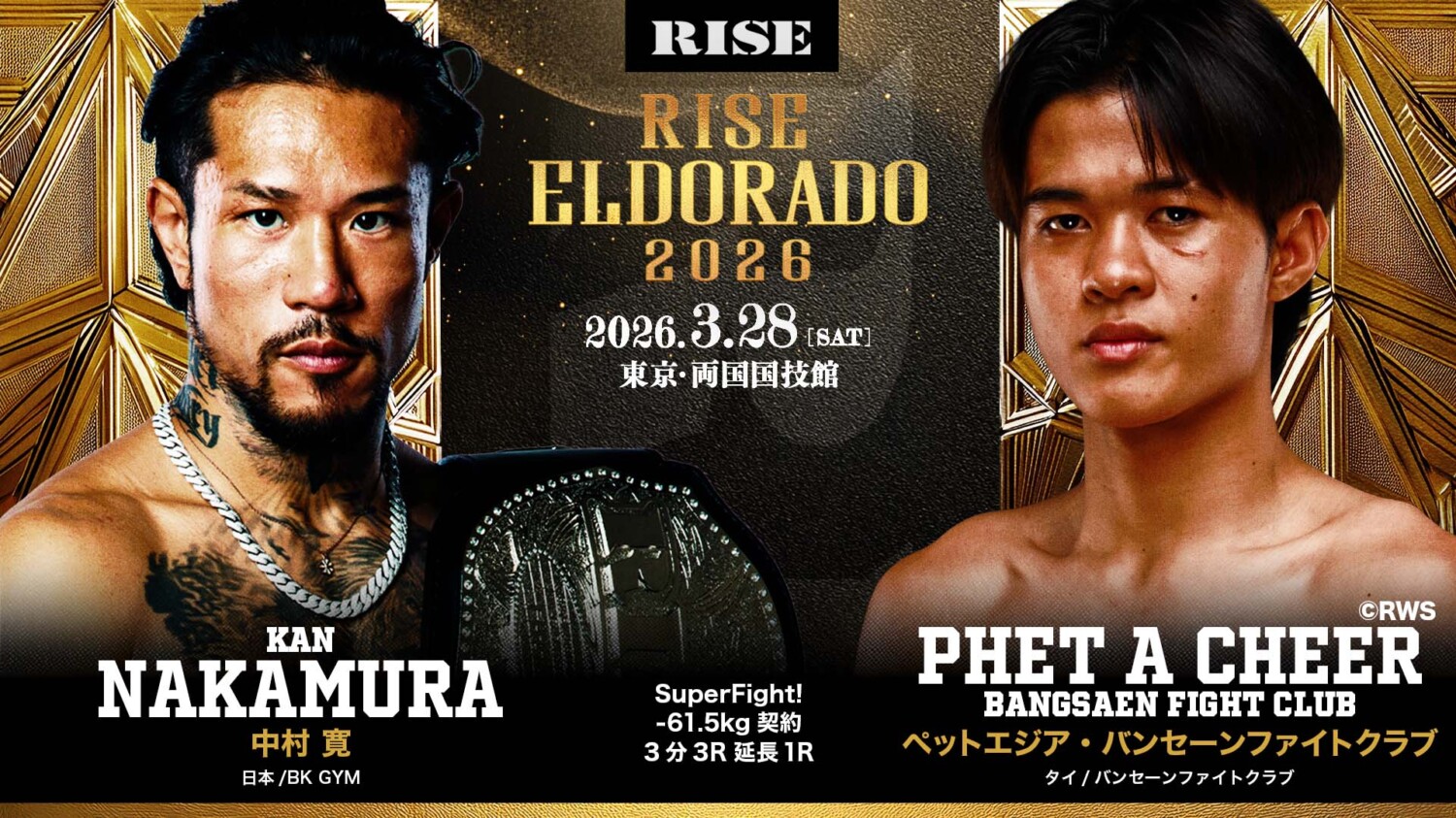 RISE ELDORADO 2026(3月28日(土)東京・両国国技館)で、RISE WORLD SERIES 2025 -61.5kg優勝の中村寛がタイのRWS推薦のタイ人選手と対戦することになった。試合決定済だった南原健太の欠場も発表された。