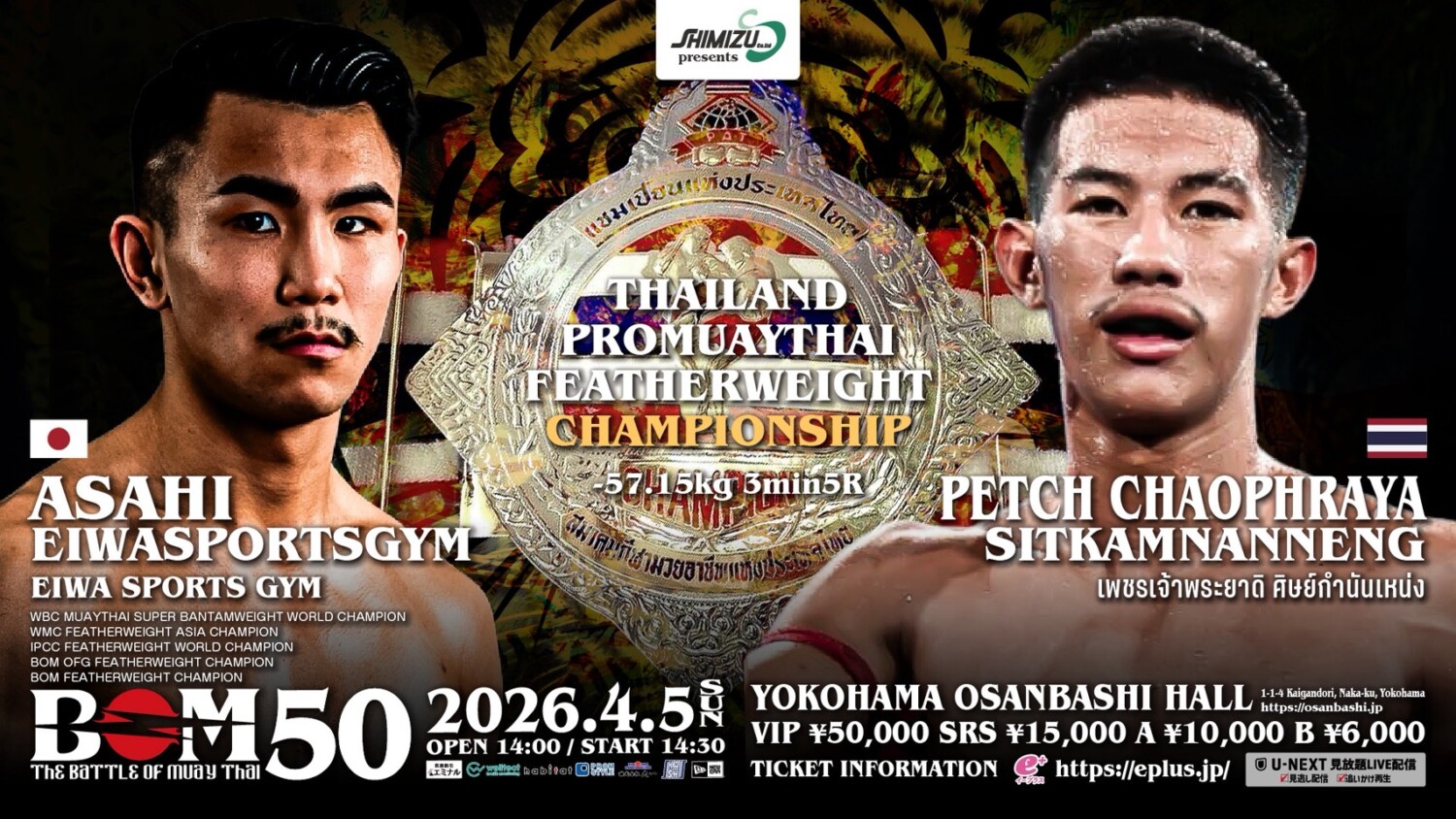 メインイベント(仮)ではタイ国プロムエタイ協会フェザー級(-57.15kg)王者決定戦として、朝陽・エイワスポーツジム(エイワスポーツジム)vsペッチャオプラヤー・シットカムナンネン(タイ)が決定。現在、ONE Friday Fightsに参戦中の朝陽の相手、ペッチャオプラヤーはムエサイアム中部地区で4階級制覇している選手で、ここ数戦はジットムアンノンやスックパランマイのプロモーション興行で活躍しているテクニシャンタイプの選手だという。