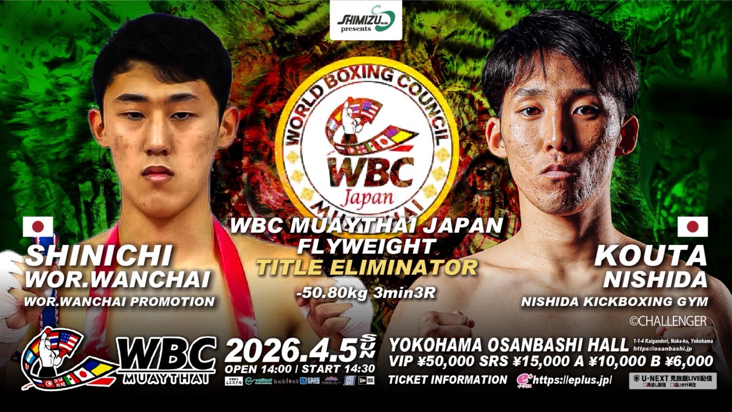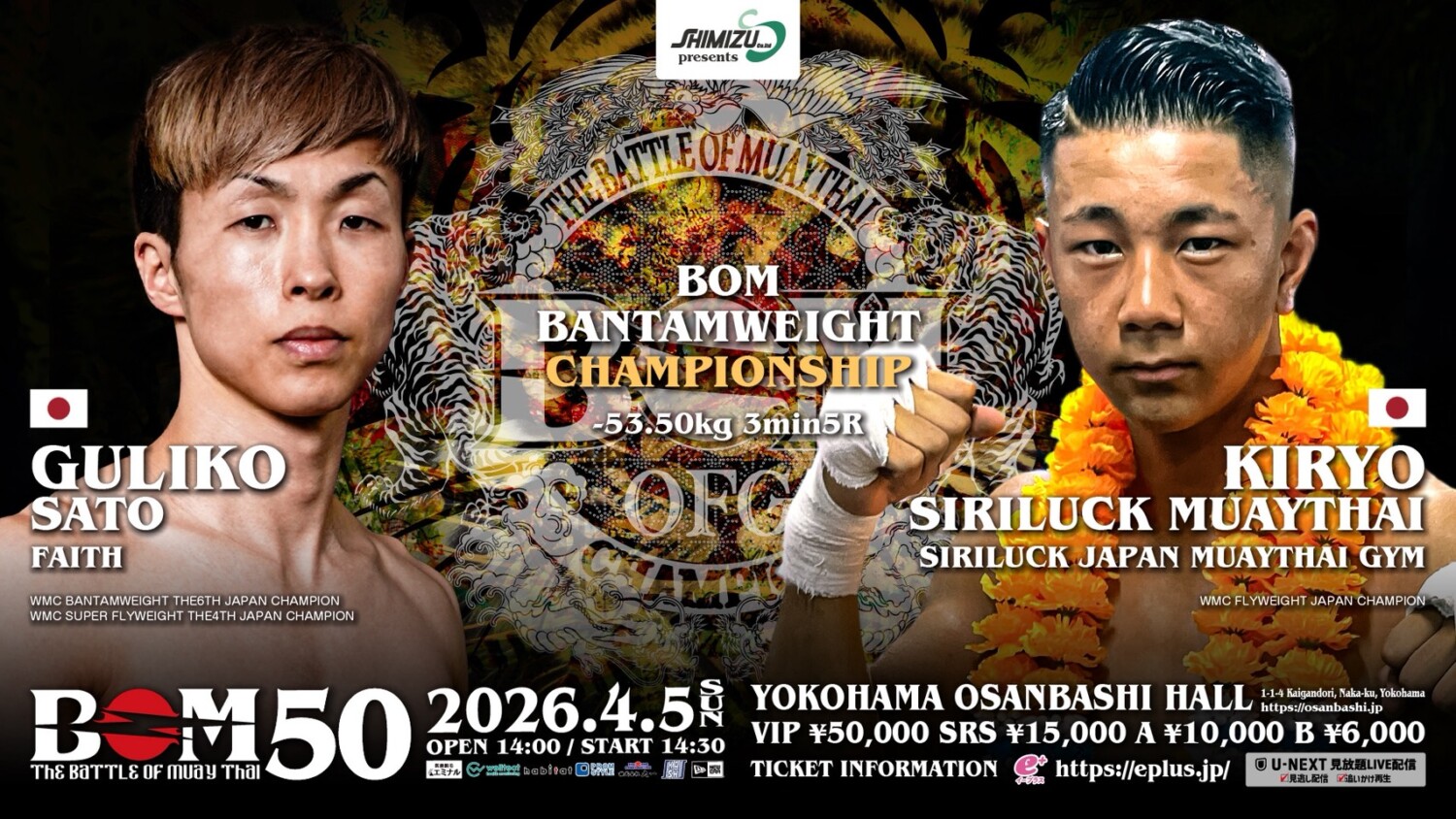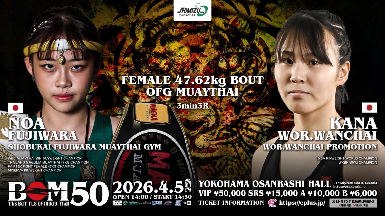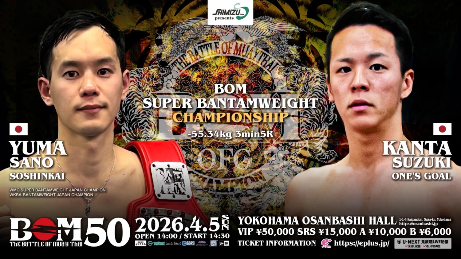 2026年4月5日(日)神奈川・横浜大さん橋ホールで開催される『Shimizu presents BOM 50』(U-NEXT配信)の記者会見が横浜市内で行われ、主要対戦カードが発表された。(記事提供:BOMプロモーション)