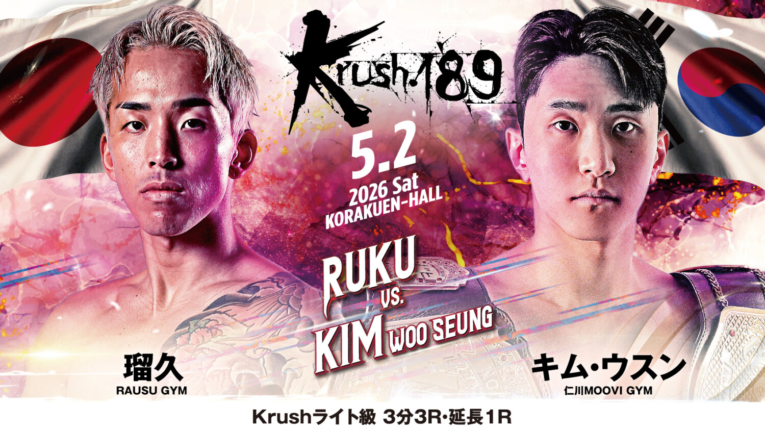 また、ライト級で“韓国最強”キム・ウスンがKrush初参戦!2025年9月にライト級転向初戦で篠原悠人に初回KO負けを喫した瑠久(RAUSU GYM)が再起戦に臨みます。近年ますます盛り上がりを見せるK-1 GROUPライト級戦線の勢力図を揺るがす可能性を秘めた一戦にご期待ください。