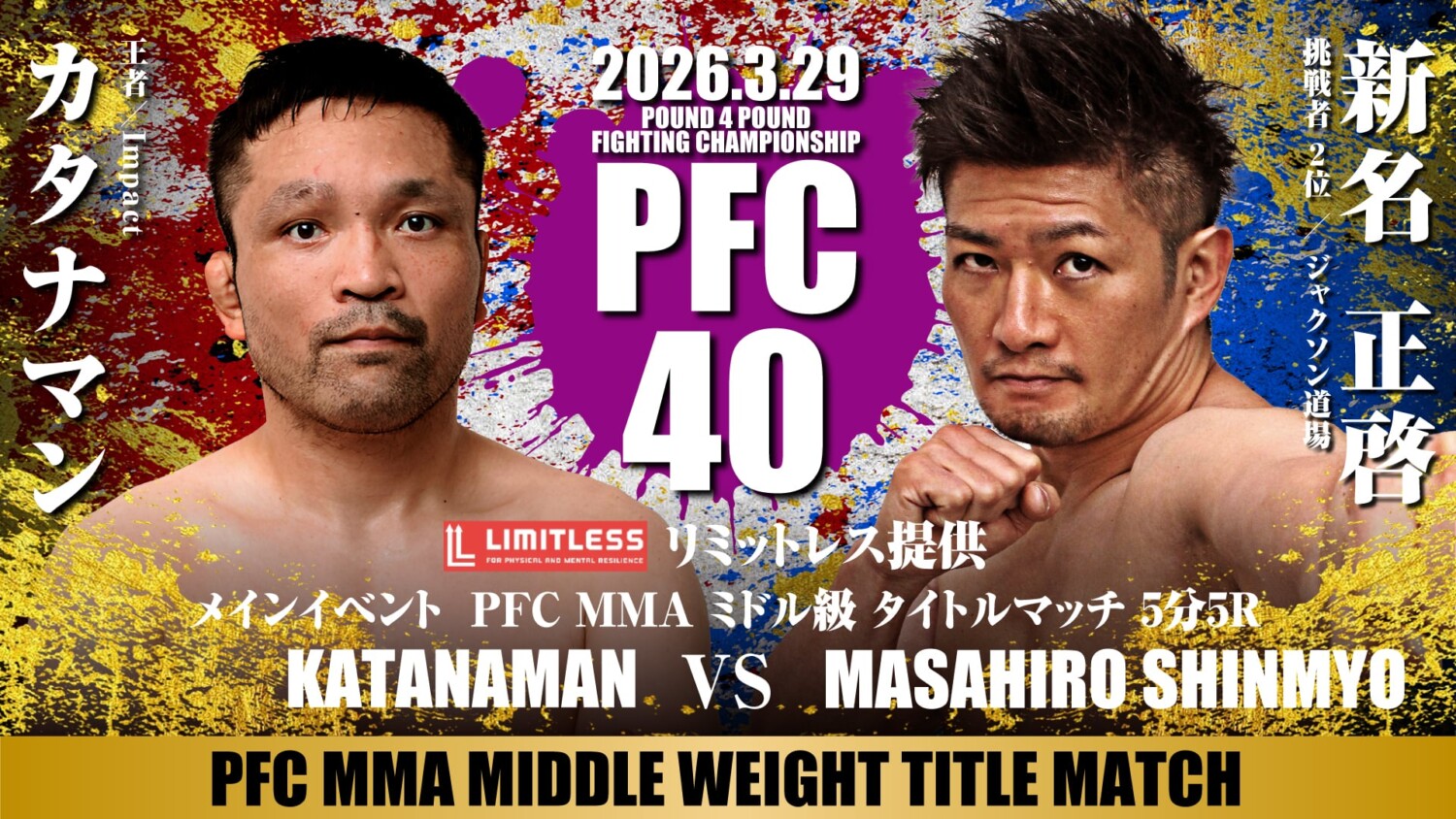 PFC 3.29 札幌 PODアリーナ:ミドル級王者 カタナマン、王座奪還&リベンジ狙う新名正啓と防衛戦。森永ユキトのバンタム級王座挑戦権懸け地元のジミー西将希と青木大地が激突