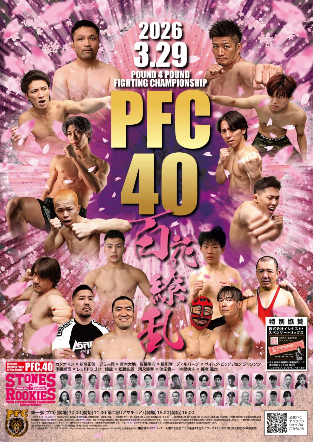 日時 2026年3月29日(日)第1部 PFC.40(プロ)開場 10:00 開始 11:00 / 第2部 STONES&ROOKIES(アマチュア)開場 15:00 開始 16:00