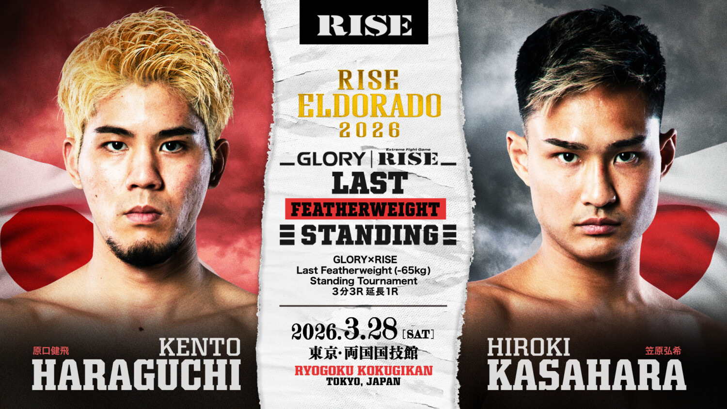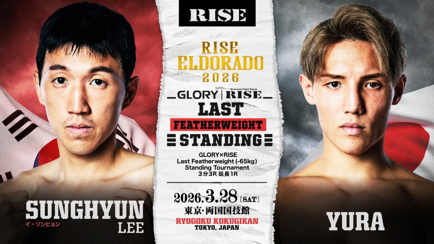 RISE ELDORADO 2026(3月28日(土)東京・両国国技館)で「GLORY×RISE LAST FEATHERWEIGHT(65kg)STANDING TOURNAMENT 準々決勝」で対戦する原口健飛と笠原弘希、イ・ソンヒョンと戦うYURAの日本勢3選手のインタビューがRISEから届いた。