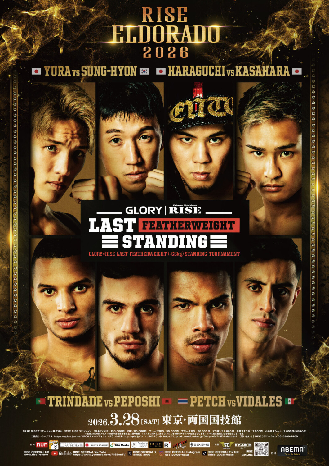 RISEとGLORYが共同で開催する24選手参加の65kg契約トーナメント「GLORY×RISE LAST FEATHERWEIGHT STANDING TOURNAMENT」が25年6月から26年6月までの1年間に渡って開催されている。25年6月の横浜大会、8月の大田区総合体育館大会で一回戦4試合ずつ計8試合が行われ、勝った8選手がシードの8選手と、10月と12月のGLORY、11月2日のRISE両国大会で二回戦を行った。26年3月28日のRISE ELDORADO両国大会で準々決勝、6月6日大田大会で準決勝と決勝を1大会で行う。準決勝まではRISE勢同士、GLORY勢同士の対戦構図となり、決勝ではRISE代表とGLORY代表が戦う。