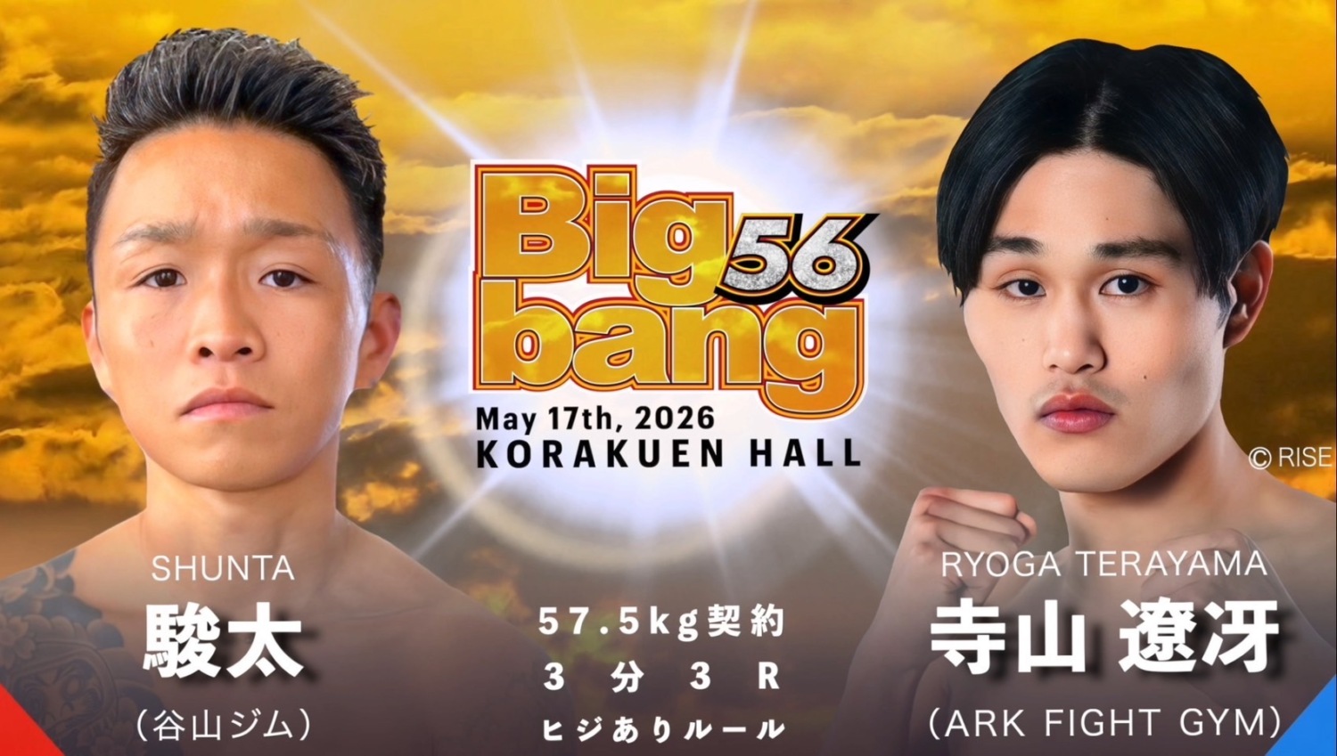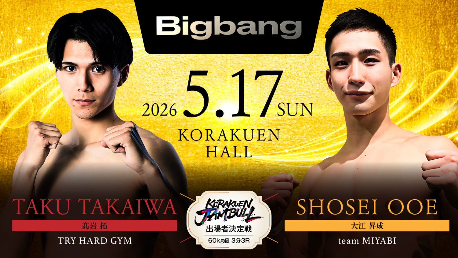 Bigbang 5.17 後楽園ホール:寺山遼冴、肘有りルールで駿太と対戦。HIROYUKIは蘭丸と。ONEで勝利のブラックシーサー颯太朗はK-1の海凪と対戦。KORAKUEN JAMBULL出場者決定戦も