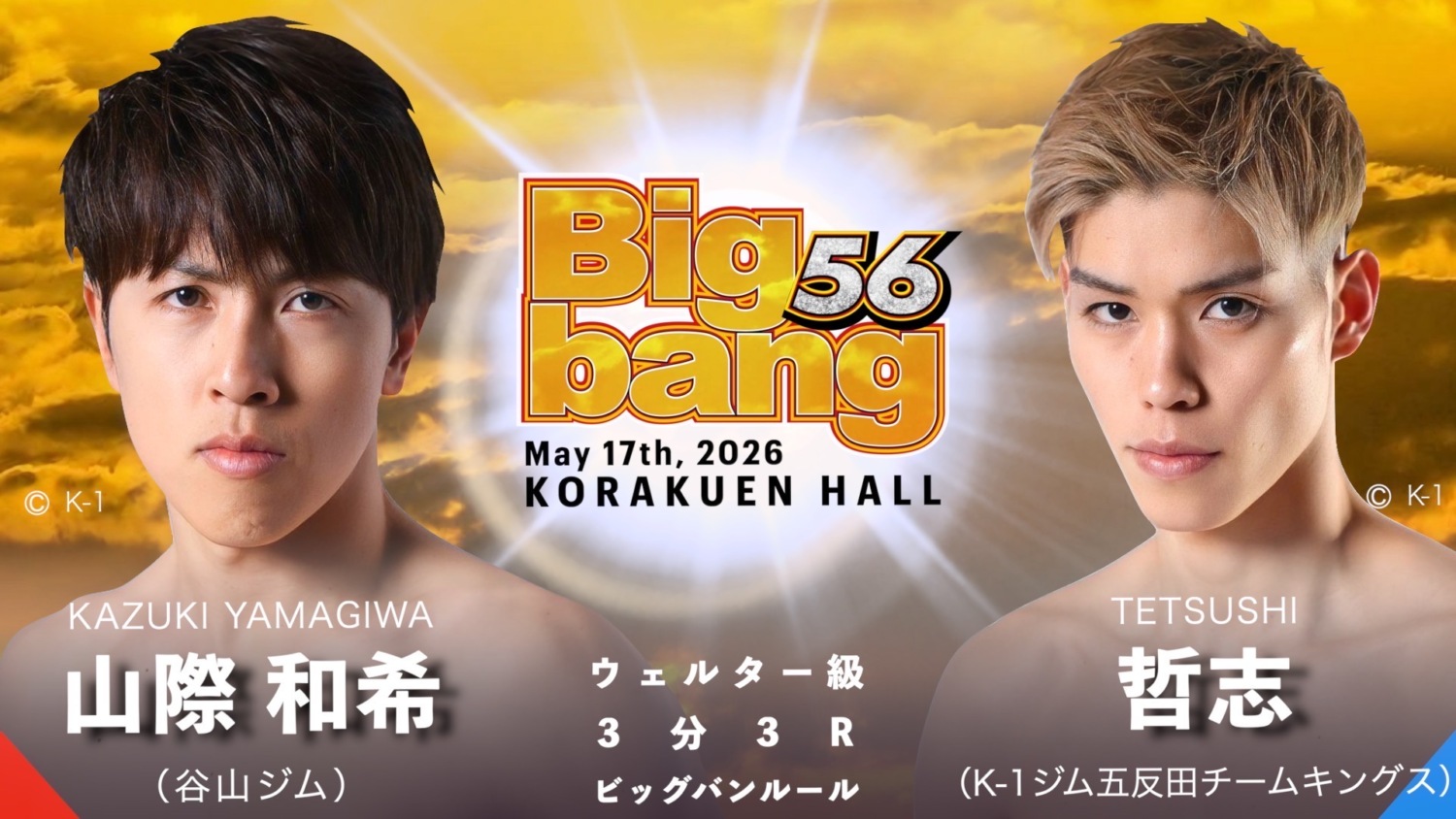ウェルター級では、初代Bigbangウェルター級王者の山際和希(谷山ジム)が、哲志(K-1ジム五反田チームキングス)と対戦する。