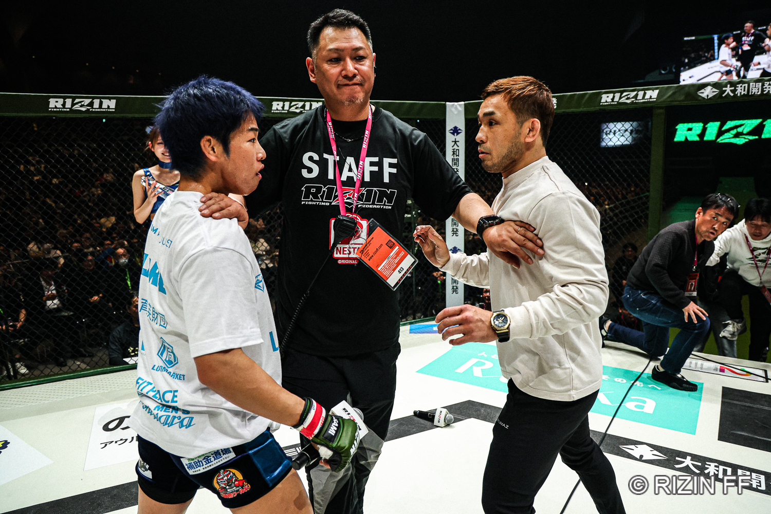 休憩時間前、扇久保と元谷、RIZINの榊原信行CEOがケージに登場し、榊原氏は扇久保と神龍のフライ級タイトルマッチを正式に発表した。