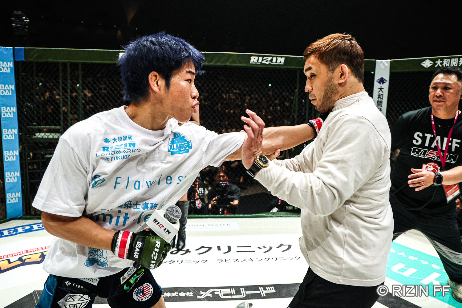 (ケージ内では未来選手がBreakingDownの宣伝もされていました。あちらとのクロスプロモーション的な動きはあるのでしょうか)未来はちょっと照れくさそうにしてましたけど、同じ6月にここマリンメッセでBreakingDownを開催するっていうことが発表されていたので、僕から「せっかくこれだけ1万4千人も入ってくれている場で、そのことをアナウンスしない手はないんじゃないの?」と言って、その機会を作らせていただいたということではあるんですけどね。RIZINとBreakingDownが交わると言っても、プロモーション対プロモーションには(選手全体の力量差があるため)ならないんで。ただ、芦澤竜誠がああいう形でBreakingDownの選手(井原良太郎)に負けたというのは、これは間違いのない事実ではあります。その1分という刹那の中での戦いに、RIZIN側から出ていくんだという選手がこれからもいるとするならば、僕らは止めることはないです。誰かそのぐらいの気概を持ってリスクを取りに行ってくれる選手がいてもいいのになと思うので、「芦澤の骨は俺が拾う」ぐらいの感じでBreakingDownに乗り込んでくれることがあってもいいと思います。