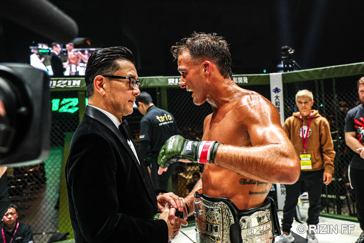 後藤丈治選手対ダニー・サバテロの試合で言うと、サバテロを責めるべきか、後藤選手を責めるべきかちょっと分からないんですけど、勝つのはサバテロ、それはいいんですけど、5分3ラウンド漬けまくられてもですね、「決めろよ」って感じですね。あの戦い方を日本のファンは是としないんで。プロモーターである私も是としないんで。「勝ちさえすればいい」んだったら他の団体へ行ってくれ、という感じに思います。RIZINのチャンピオンであることをサバテロが強く主張したいのであれば、ファンのハートを鷲掴みにする、ファンの想像を超えるフィニッシュをチャンピオンとして見せつける必要があります。サバテロにも「次の試合は必ずフィニッシュが必要だ」ということは強く言いました。ビッグマウスは素晴らしいと思いますけど、それを言えるほどの圧倒的にワンサイドな試合でしたけども、ファンの満足度で言うと40%か50%かというところなので。今後は王者として、もう少し我々が、ファンが求めるものに応えられるようなものを見せてもらいたい。言うのは簡単ですけど、トップアスリート、スーパースターはそれができるんで。それをやらない限り、彼が真のスーパースターになることはないと思いますので、それは彼のために強く伝えたいなと思っています。