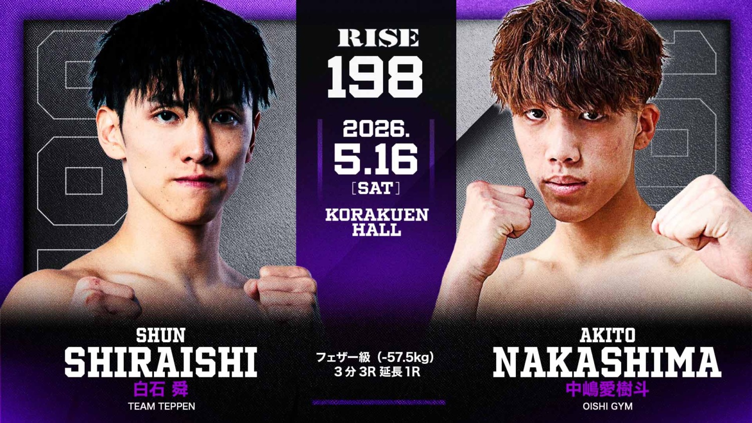 昨年5月のONEフライデーで中国の選手に勝利した実績もあるOISHI GYM所属の中嶋愛樹斗がRISEに初参戦し、フェザー級10位の白石舜と対戦する。